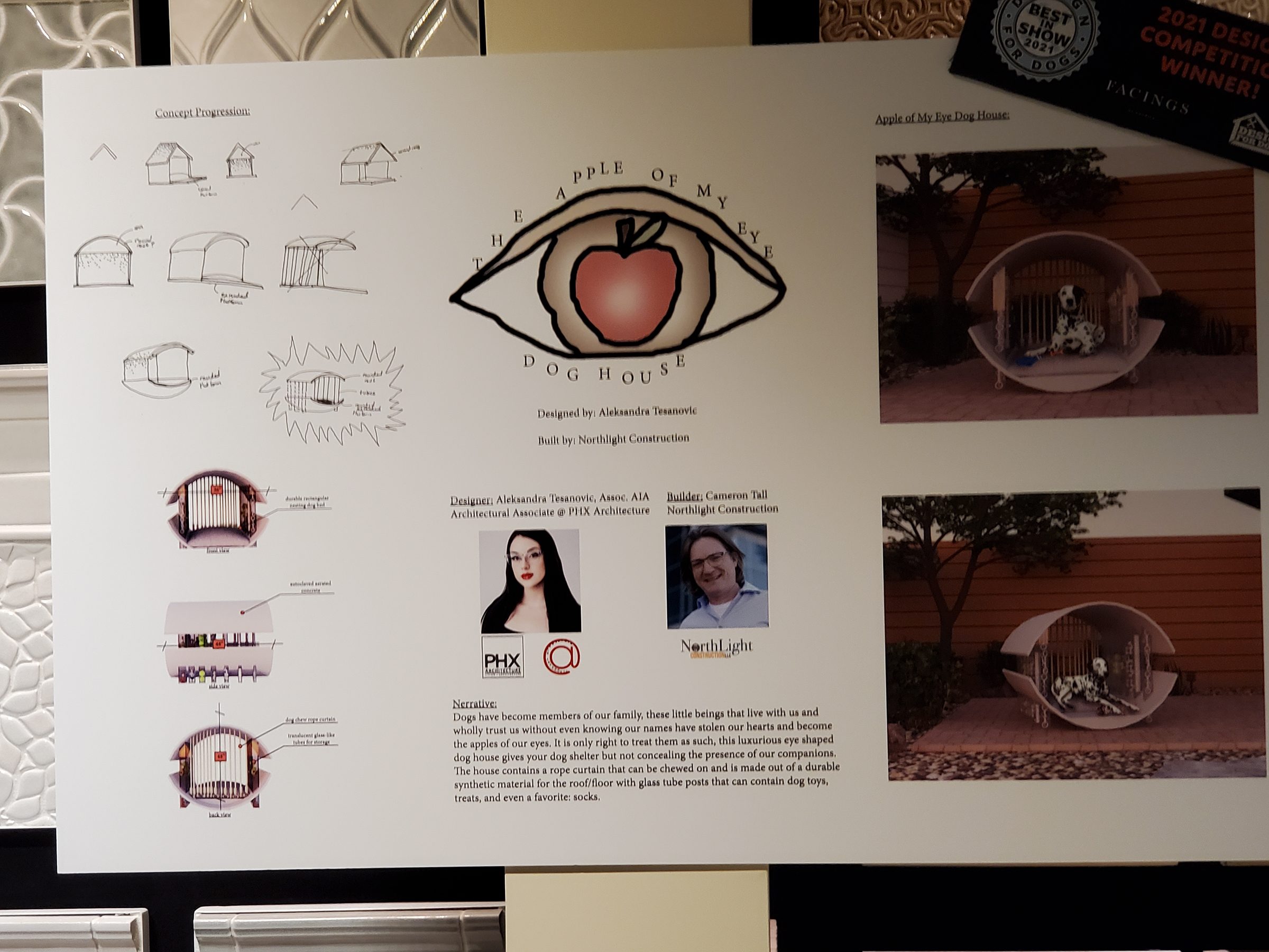 On February 25th, PHX’s own Sasha Tesanovic was honored for her winning Design For Dogs competition. The celebration took place at Facings of America showroom on February 25th and Sasha was accompanied by colleagues and friends. She also got the incredible chance to see her award-winning design come to life, built by Cameron Tall with North Light Construction. Cameron generously donated his resources and his time and we are very grateful. The dog houses were then auctioned off for charity. Sasha’s design titled, “Apple of My Eye” actually won in 2020, but due to COVID, she was celebrated alongside the 2021 winner.