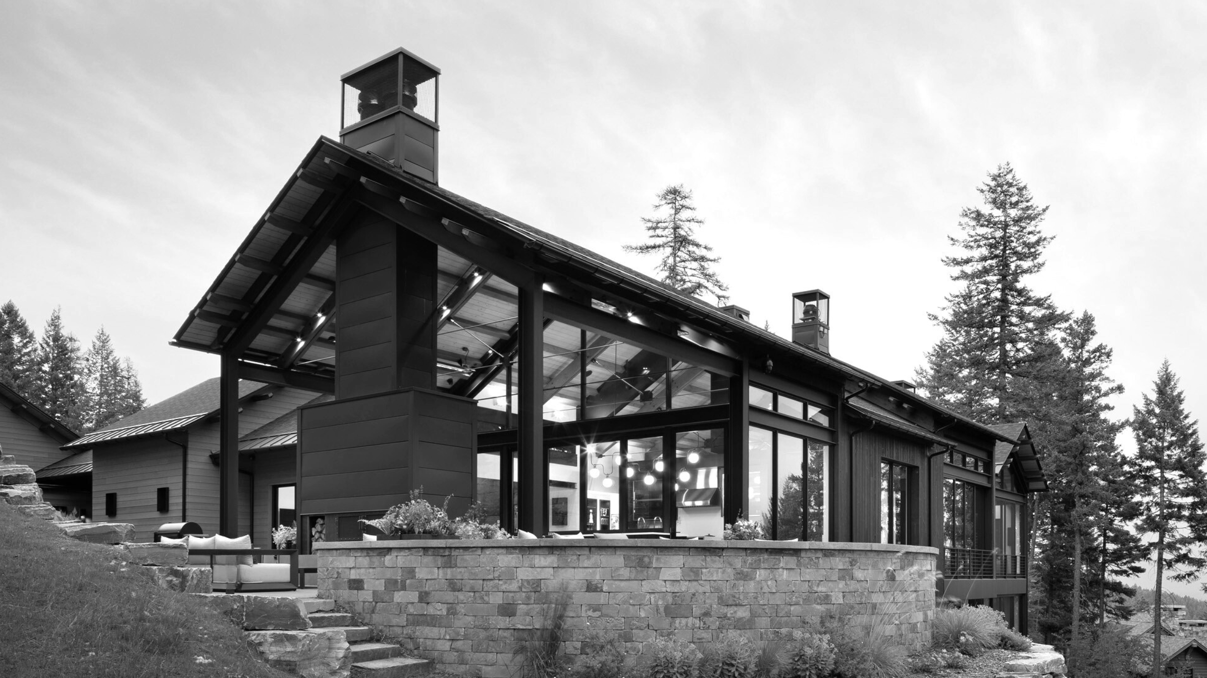 To create a cabin-like feel without compromising scale, the home was broken into three distinct volumes, each positioned to frame outdoor spaces and views. These masses form a welcoming arrival court and open up to the surrounding forest, blurring the lines between interior and exterior living. The central Great Room, which houses the main entry, acts as the heart of the home—its vaulted ceilings, expansive windows, and direct access to outdoor patios encourage effortless flow between inside and out.