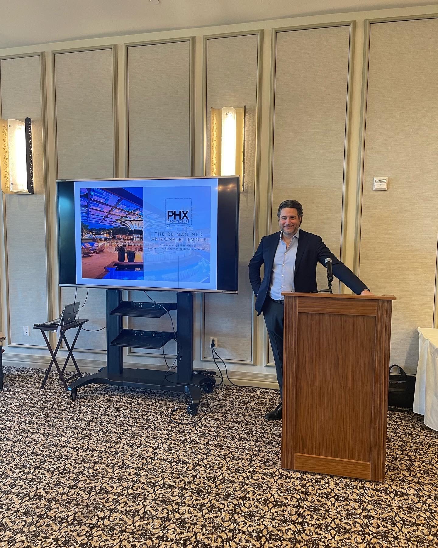 In January, Erik was asked to present for Paradise Valley Country Club’s notable Distinguished Speaker series, a series of presentation by some of the Valley’s most notable business leaders. For the presentation, Erik chose to present a detailed, behind-the-scenes look into our firm’s design for the reimagined Arizona Biltmore resort. A total of 45 minutes – Erik’s presentation included an introduction to the history of the Biltmore by renowned, Architect – James Abell – who spent a lot of time studying the history behind the historical Arizona Biltmore fire of the 1900s. Next – Erik detailed out how our firm won the job – presenting the very RFP that we put forward before being chosen by Biltmore management. Following that – Erik presented the before, during and after photos of each of the areas our firm was a part of designing (The Cottages, The Adult (Saguaro) Pool, The Family (Paradise) Pool, The Tower Slide, Renata’s Hearth and Wright’s Lounge and Bar). The discussion was followed up by questions from the audience. Thank you Paradise Valley Country Club – who has been a long standing client of PHX for providing PHX and Erik the opportunity to present, it was an incredible way to get involved with the membership at the Club and share little bit more about one of our most noteworthy hospitality projects to date.