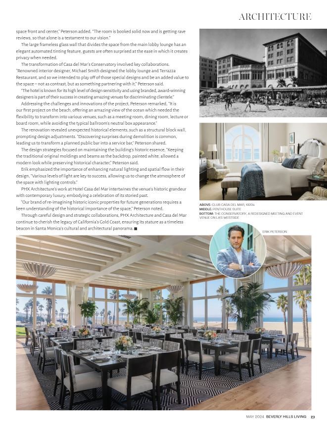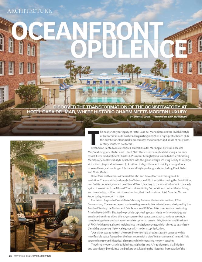 Here’s to another project making its mark in a prestigious publication! Casa Del Mar is proudly featured in Beverly Hills Living, showcasing our commitment to excellence. The latest chapter in Casa del Mar’s history features the transformation of The Conservatory. The newest event and meeting venue in LA’s Westside was designed by Jim Smith of Serving the Nation and Erik Peterson of PHX Architecture, an award-winning firm in Beverly Hills. Situated to provide captivating ocean views with two-story glass enveloped on three sides, this 1,750-square-foot space can adapt to various events, is completely private, and can accommodate up to 120 guests. Erik, founder and President of PHX Architecture, shared insights into the design process, which aimed to seamlessly blend the property’s historic elegance with modern sophistication.