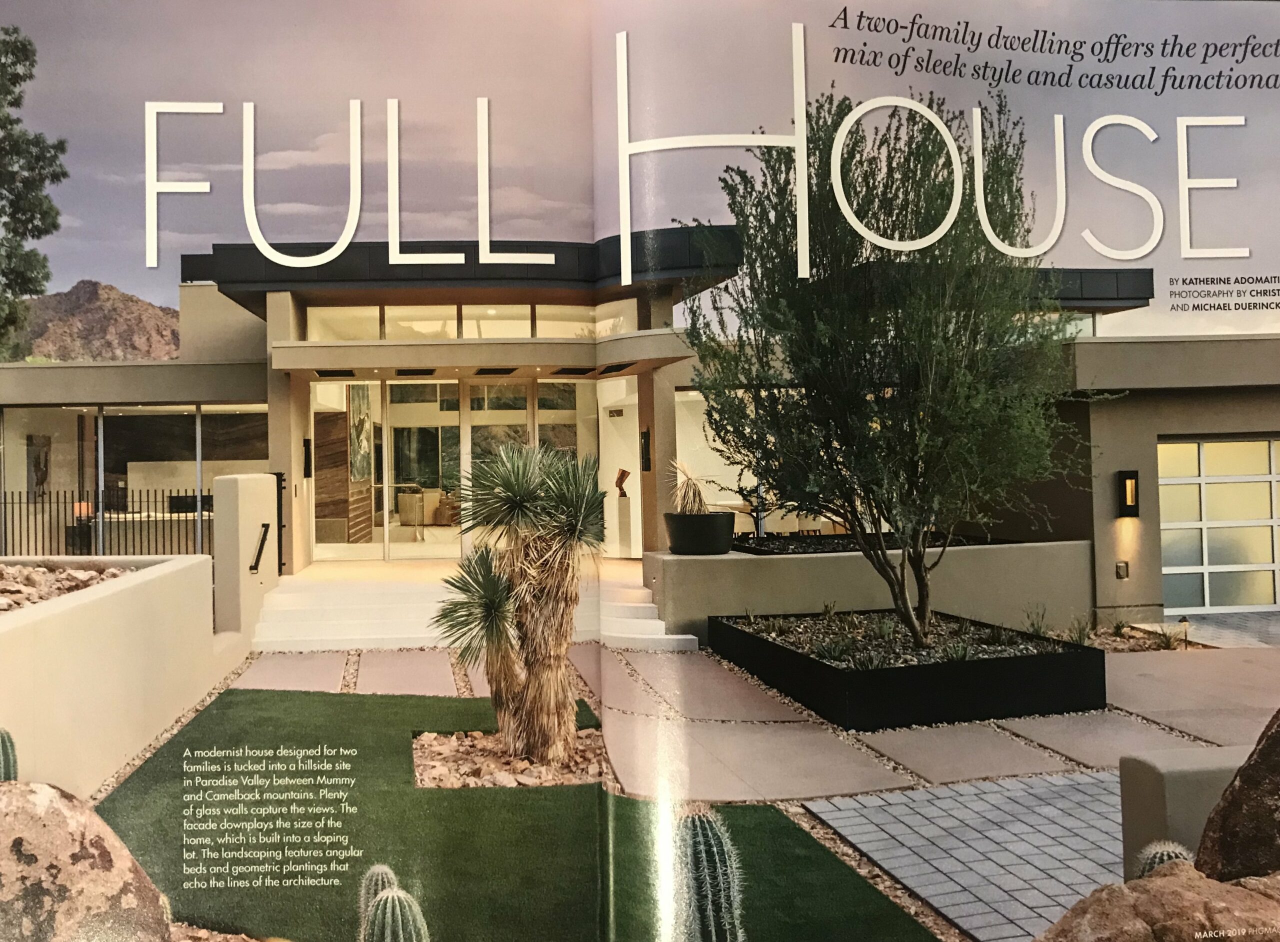 We are thrilled to share that one of our favorite contemporary builds, located in Paradise Valley was featured in the March issue of Phoenix Home & Garden. The multiple page spread included quotes from Erik Peterson as well as John Schultz of Schulz Development, Tony Sutton of Est Est Inc. and the homeowners – Roland & Melanie Folz. Described as “the perfect mix of sleek style and casual functionality,” the article captures the modern yet comfortable elements of the home including the contemporary glass, stucco and steel materials as well as the very unique location of the home – sitting between the iconic Mummy and Camelback mountains.