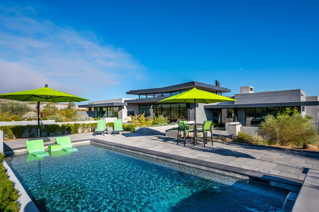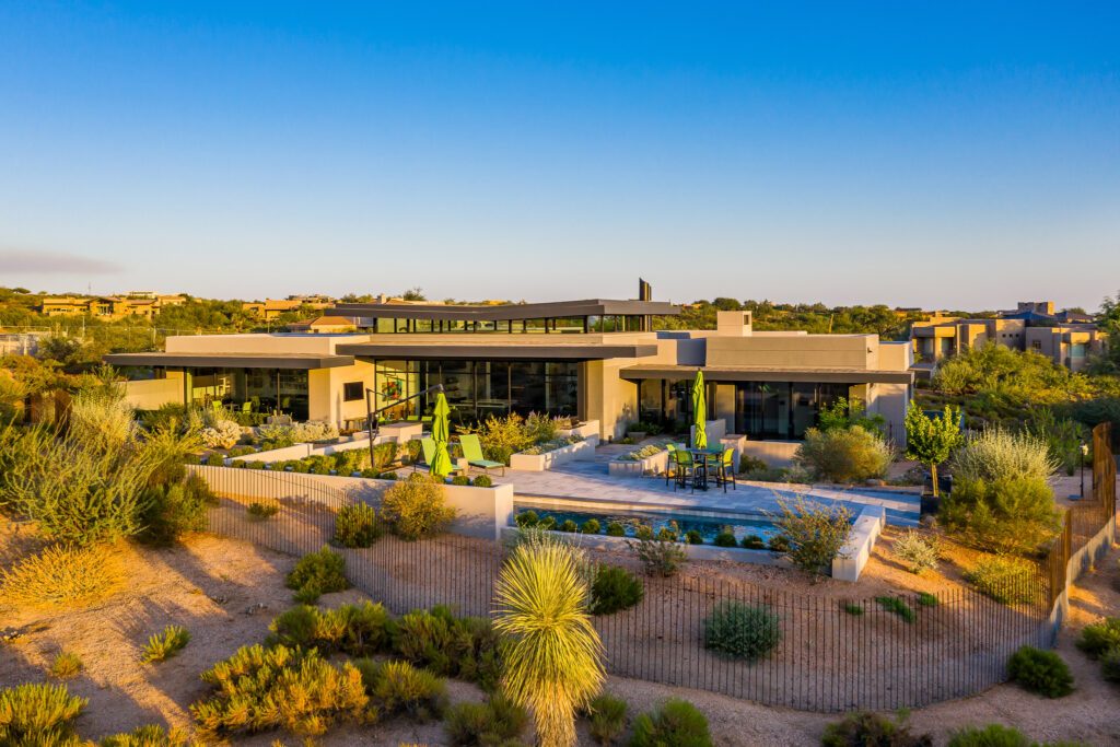 Streamlined Modernism unites with today’s indoor-outdoor ”casual elegance” lifestyle in Desert Mountain’s Village of Painted Sky. The multiple roof lines, 17′ soaring ceilings with perimeter clerestory windows, open split floor plan, clean lines and the use of metal, glass, stone and water create harmony between a manmade environment and Mother Nature’s Sonoran Desert. Built of stucco with horizontal reveals, metal facia and retractable walls of glass the sophistication adds to the serenity and functionality of the home. Entering the impressive glass storefront door to the perfectly designed open living space you are absorbed by: the great room with expansive seating, fireplace and TV, the posh wet bar with conversation seating, the gourmet kitchen with two More…