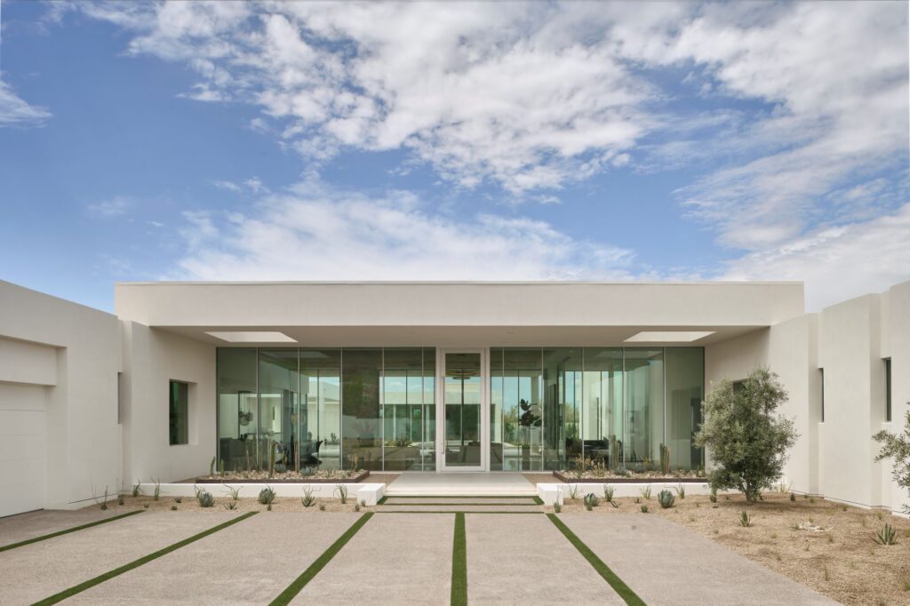 In essence, this style achieves a harmonious equilibrium between the natural desert surroundings and the demands of contemporary living. Notably, the living room stands as a testament to this philosophy, featuring impressive 14-foot floor-to-ceiling and wall-to-wall windows that present the desert lifestyle as a living work of art. Every aspect of this minimalist design is meticulously considered, with each element thoughtfully concealed yet entirely functional. The home’s architectural lines cast symmetrical, beautiful light, and the awe-inspiring vistas from every vantage point are beyond compare.