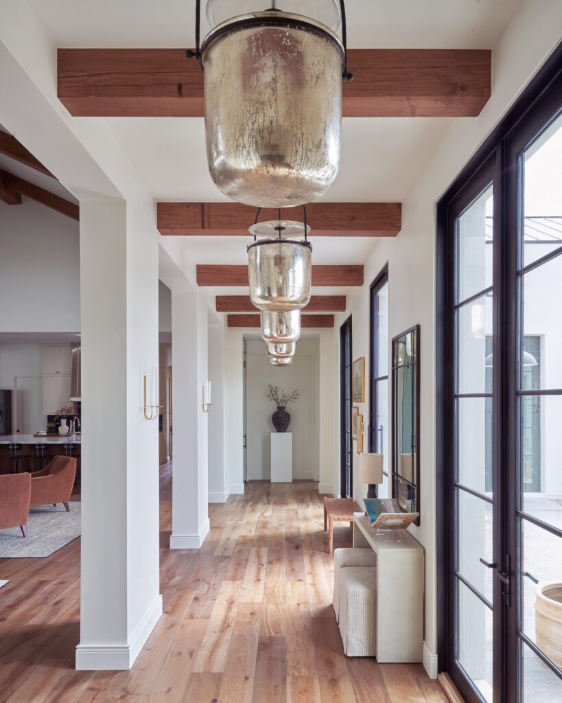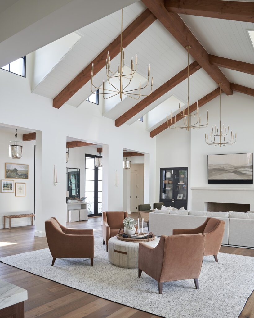 Saturated with various neutral tones on the inside, this free-flowing home is incredibly warm and welcoming to the Client and their guests. Spacious kitchen with a large-scale island and a light countertop, a statement-making dark backsplash behind the stove top with gorgeous white veins splashing across, and off-white cabinets up at the top, turning this kitchen into a marvelous gathering space.