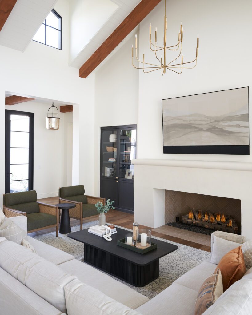 The living area is clean-cut, with smooth white walls and wooden beams on the high ceiling; this space is incredibly relaxing. The furniture is organized symmetrically; an elegant, light gray L-shaped sofa and olive green accent chairs are situated around a black wooden coffee table facing a charming fireplace. An intimate space that is a great conversation starter.