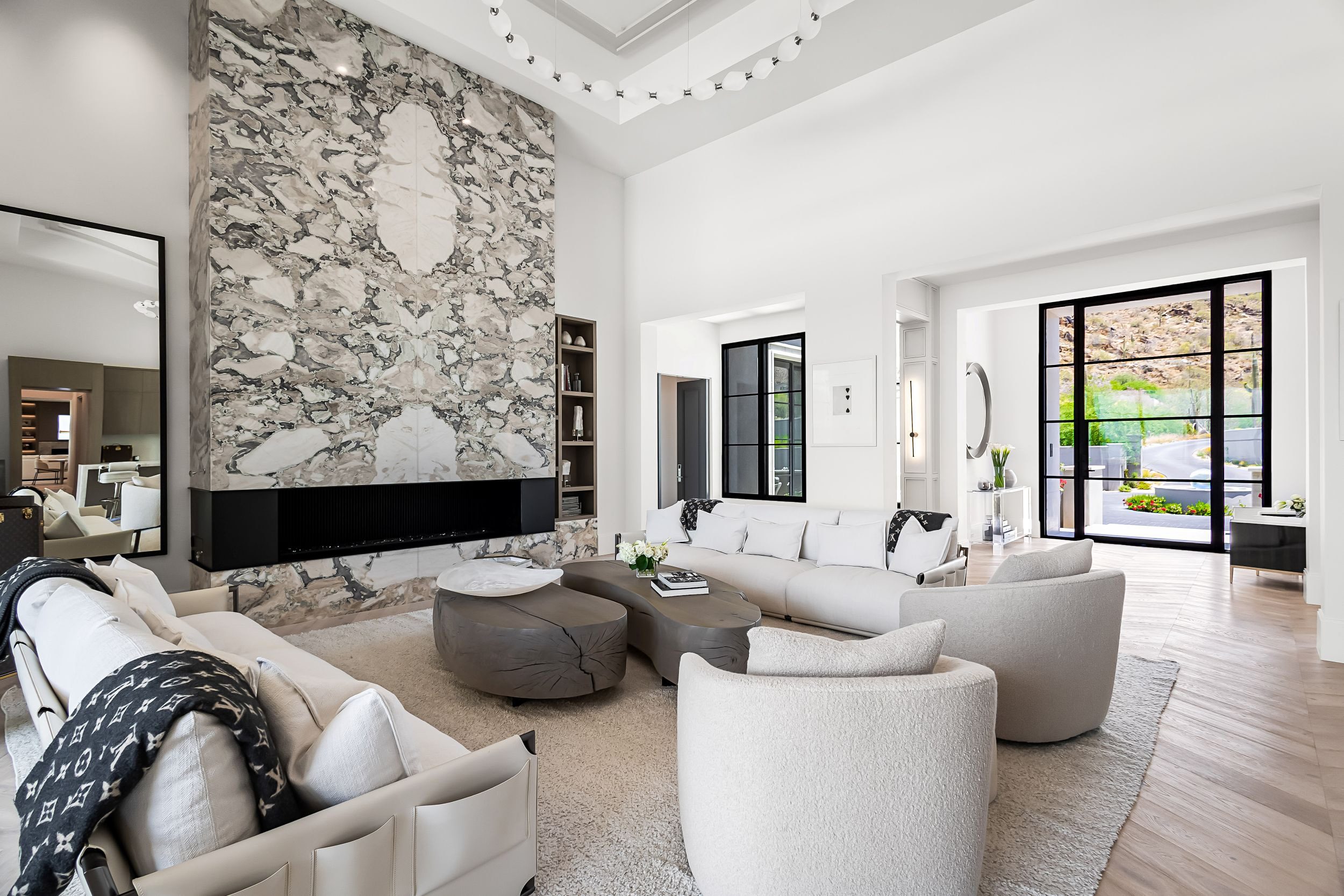 In collaboration with Sommer Custom Homes and Ownby Design—this Privately positioned custom home resides within Silverleaf’s prestigious Upper Canyon, occupying nearly 4.5 acres and meticulously crafted to balance scale, seclusion, and refined livability. The residence is defined by its soaring volumes, disciplined material palette, and a dramatic book‑matched marble fireplace that anchors the main living space. Expansive fully retractable windows frame panoramic city‑light vistas, mountain silhouettes, and vibrant sunsets.
