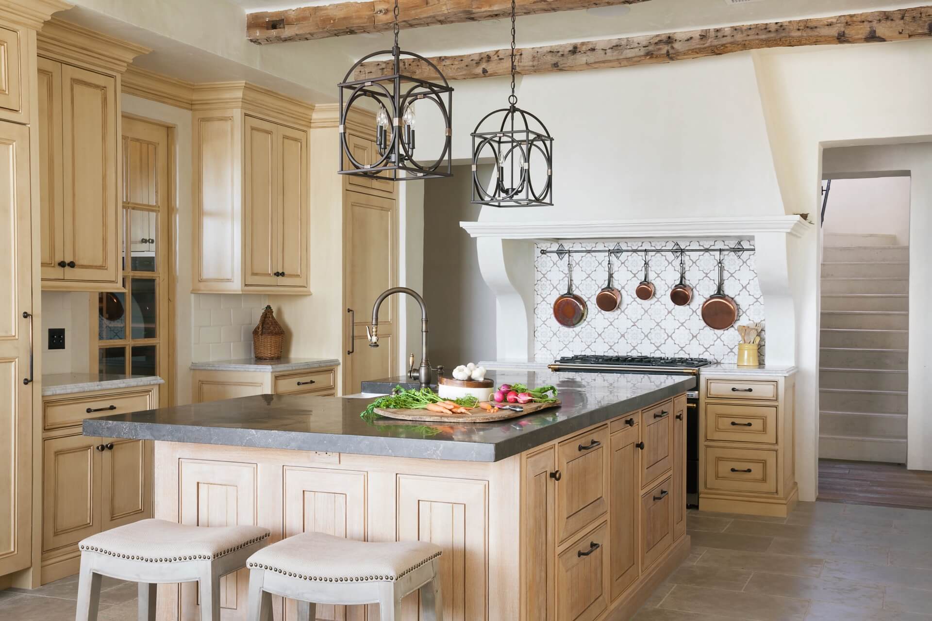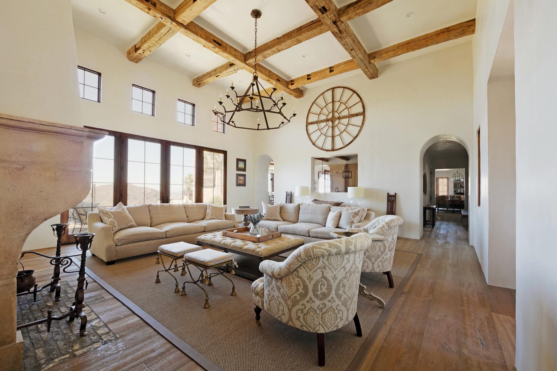 This compound in Scottsdale, Arizona, offers a modern take on a French-Mediterranean farmhouse, accented with reclaimed wood and other elements made to look distressed. In addition to the main residence–where oversize windows frame inspiring mountain vistas—the home includes a sizeable guesthouse.