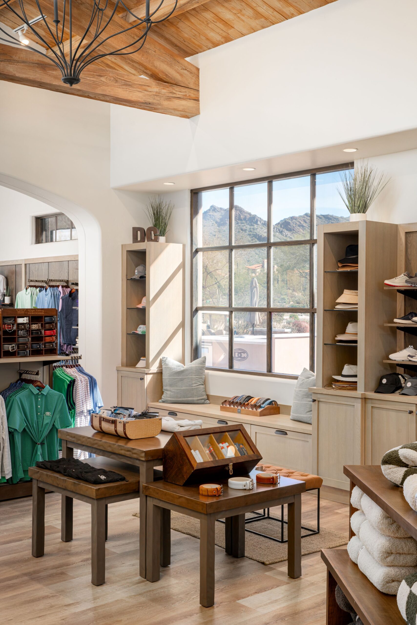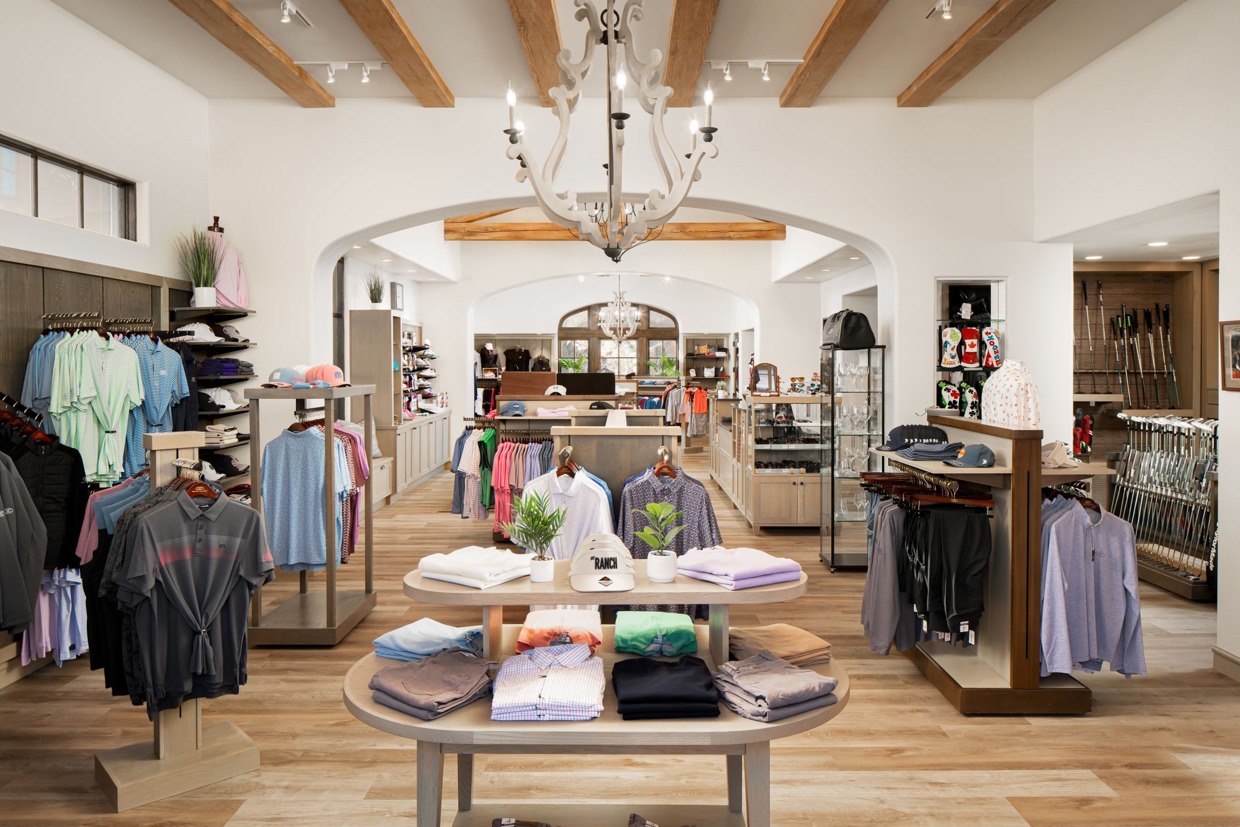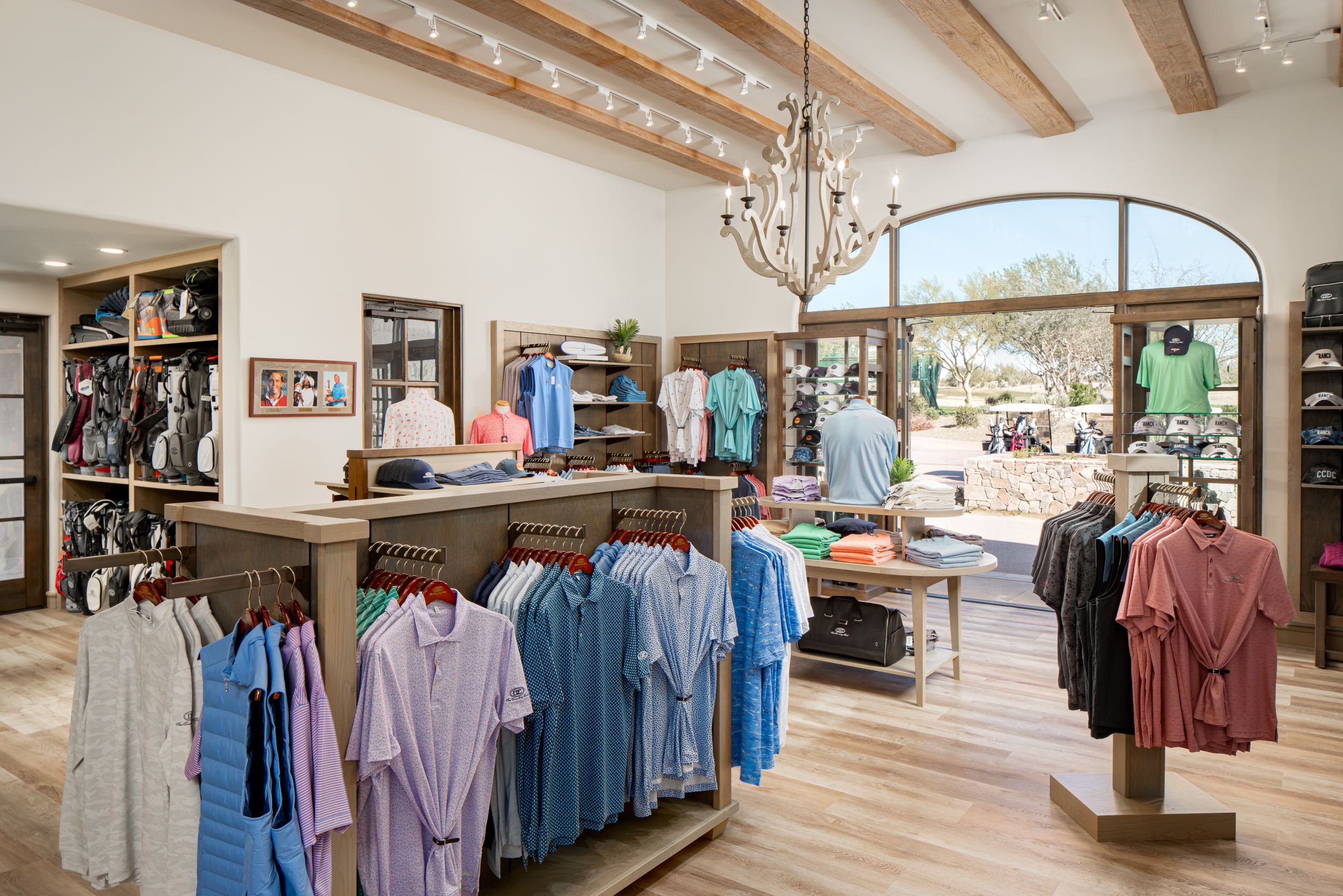 Designed to complement DC Ranch’s signature warmth and character, the refreshed Pro Shop features exposed wooden beams, which extend from the ceiling to the custom display cases, adding richness and texture. The open-concept layout, paired with elegant chandeliers and large arched windows, creates an inviting, light-filled atmosphere where members and guests can browse with ease.