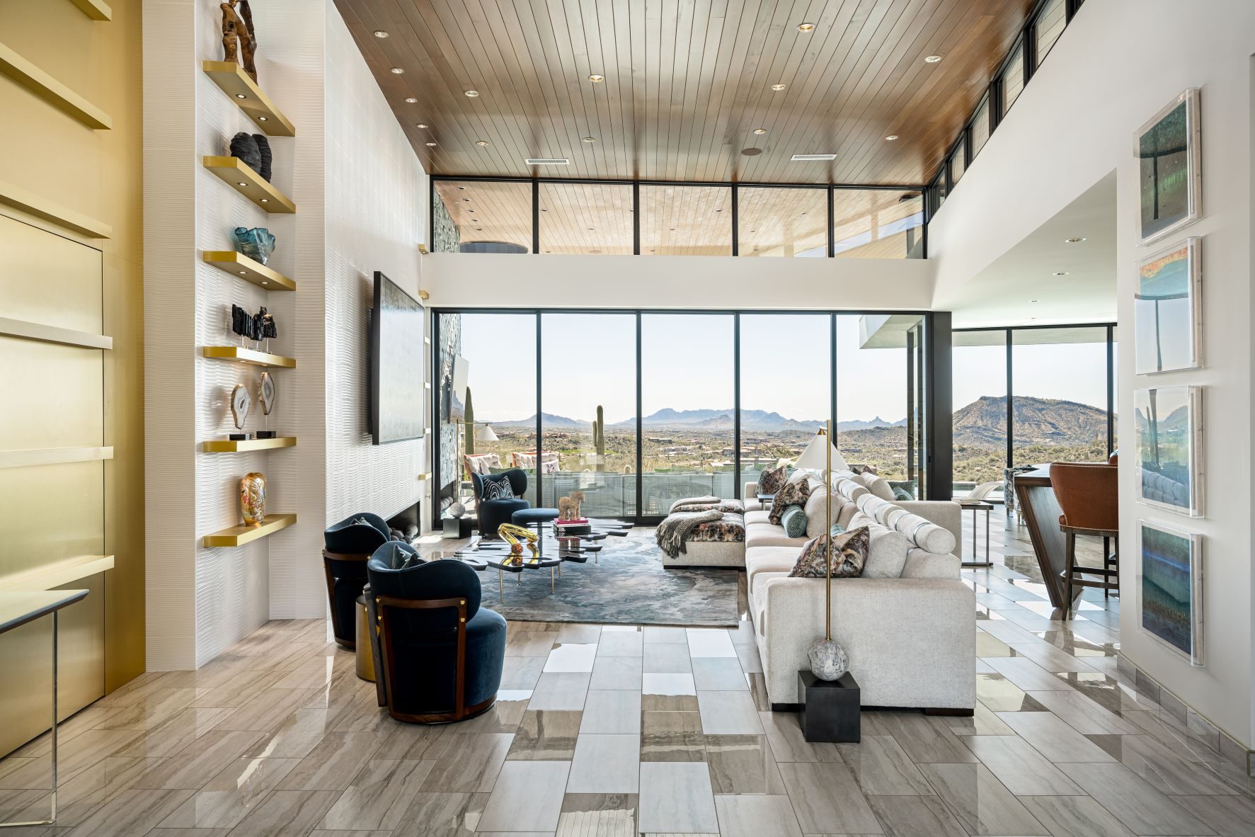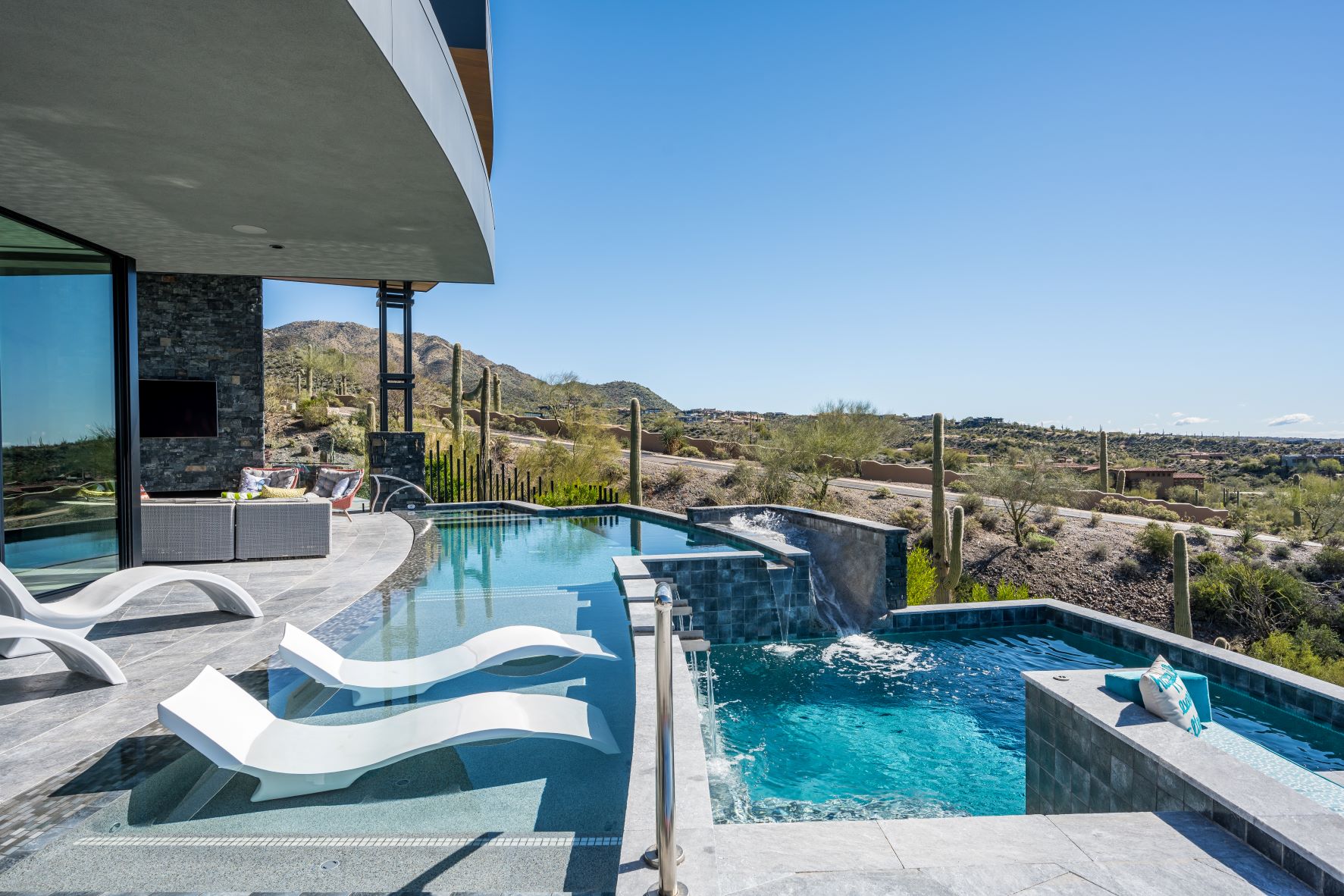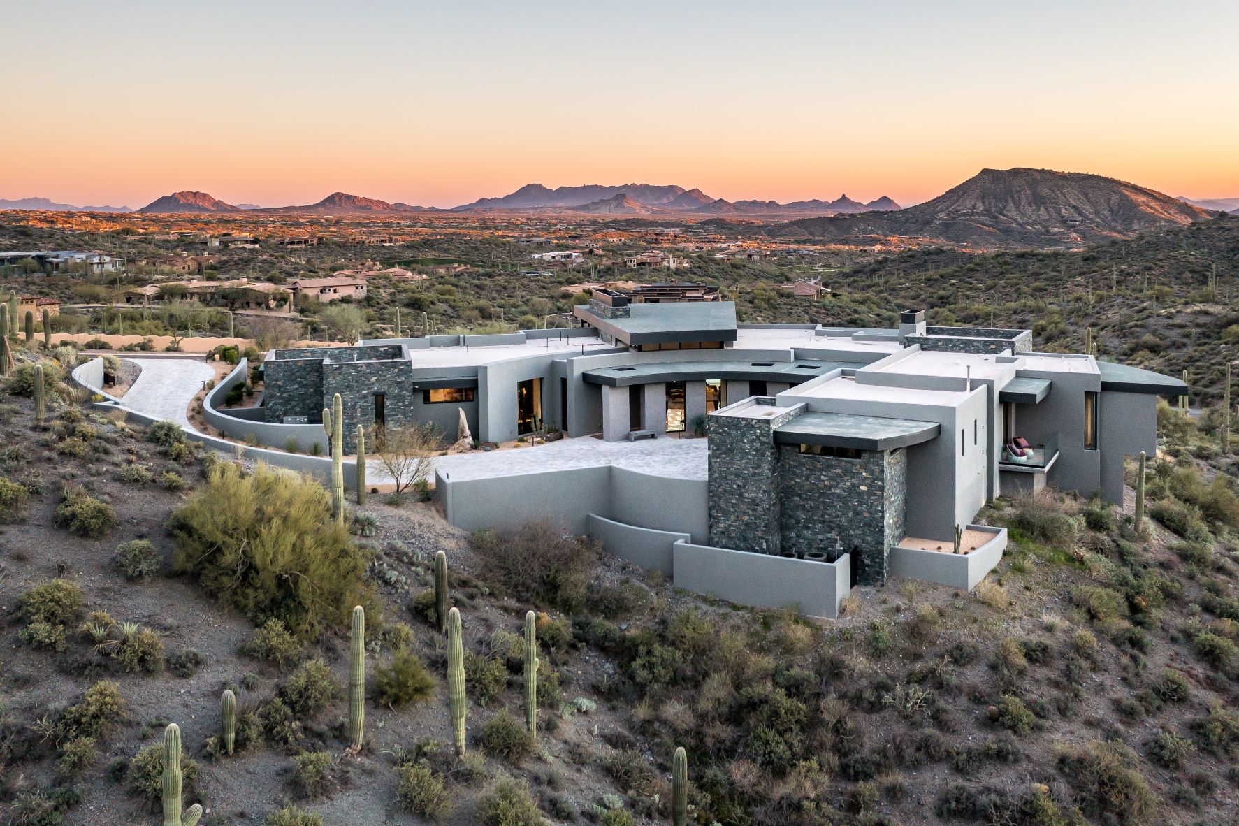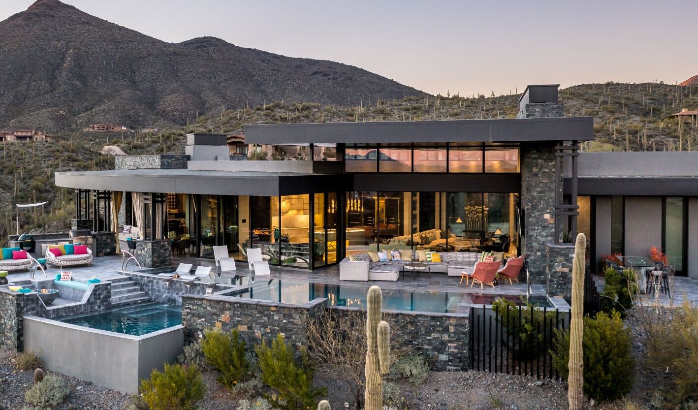 Located in the exclusive living community in North Scottsdale, Arizona this contemporary home boasts incredible desert views. Nestled on a mountainside – the home features neutral tones on the exterior with gorgeous curved lines. The interior, also contemporary is colorful and playful. The kitchen features gold accents, and the bedrooms each offer a unique design aesthetic. The home office makes a statement with gorgeous views and the master suite is expansive, including its very own patio. The backyard of this home was designed to have an oasis feel, with a resort-style pool, hot tub, slide, and several sitting areas with gas firepits and an outside dining area.