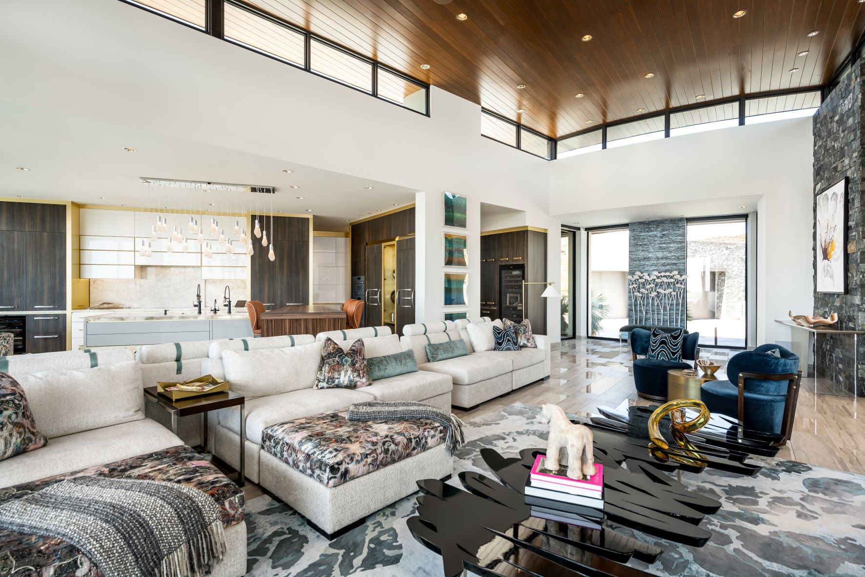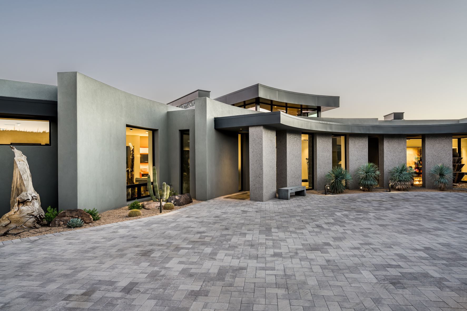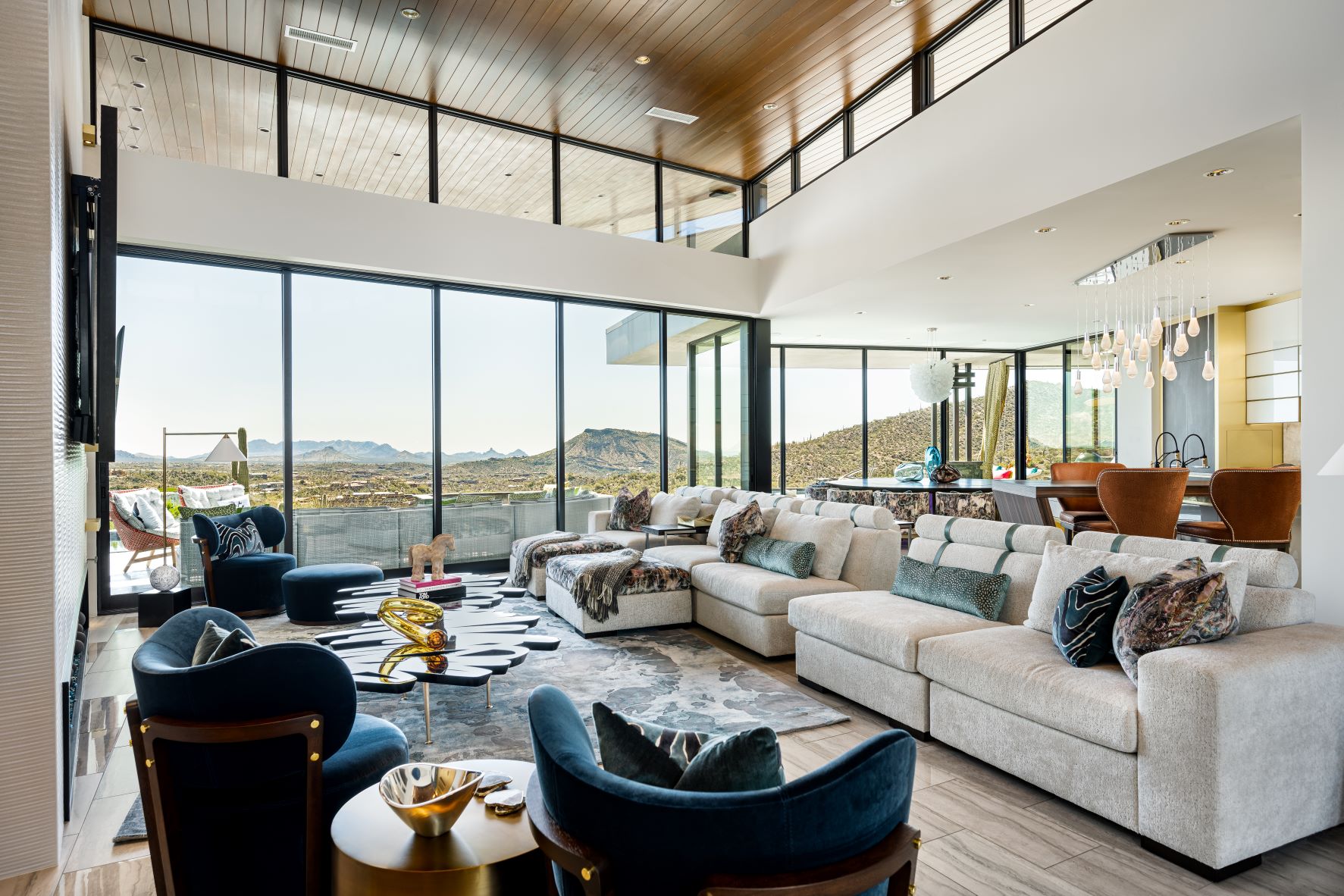 Located in the exclusive living community in North Scottsdale, Arizona this contemporary home boasts incredible desert views. Nestled on a mountainside – the home features neutral tones on the exterior with gorgeous curved lines. The interior, also contemporary is colorful and playful. The kitchen features gold accents, and the bedrooms each offer a unique design aesthetic. The home office makes a statement with gorgeous views and the master suite is expansive, including its very own patio. The backyard of this home was designed to have an oasis feel, with a resort-style pool, hot tub, slide, and several sitting areas with gas firepits and an outside dining area.