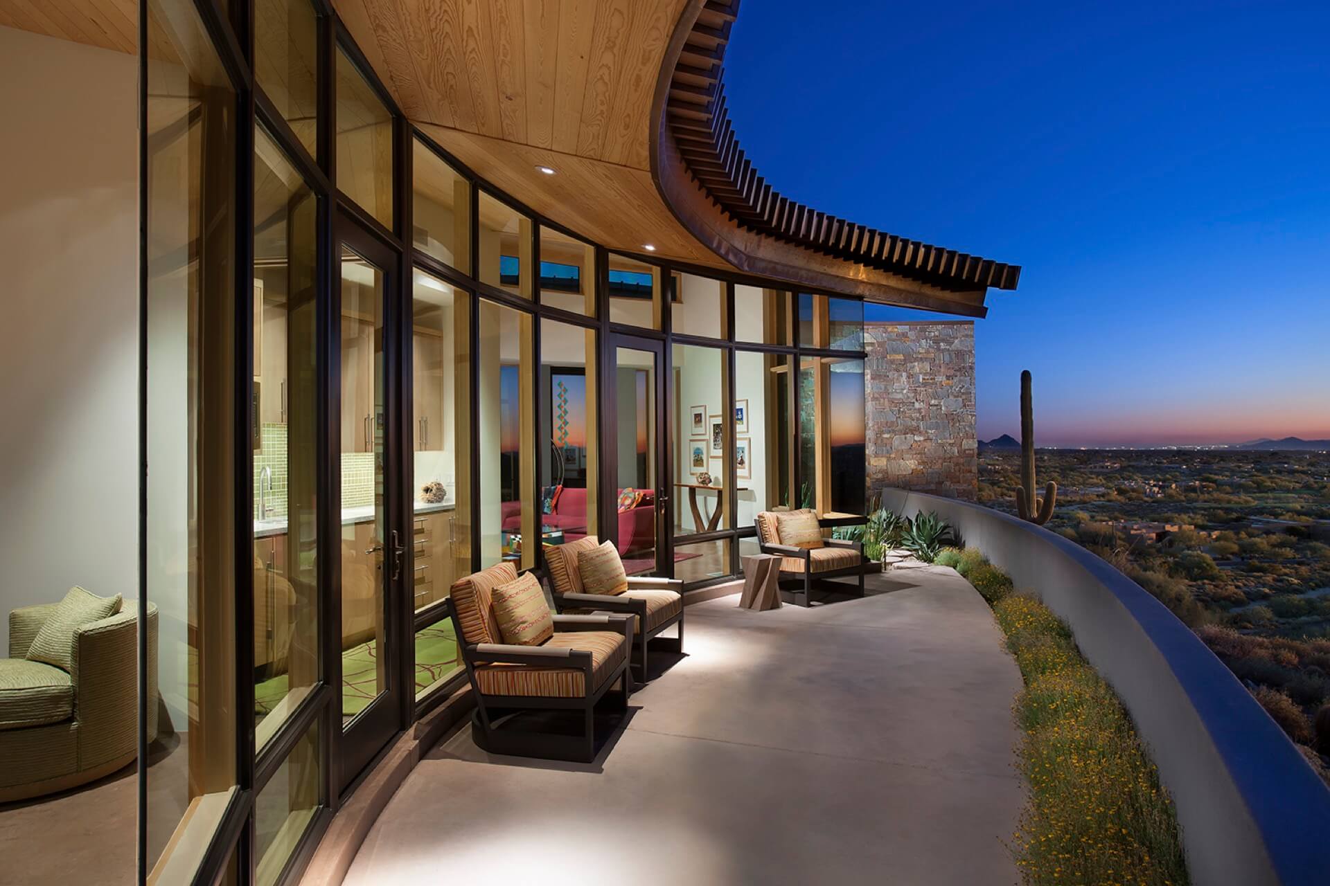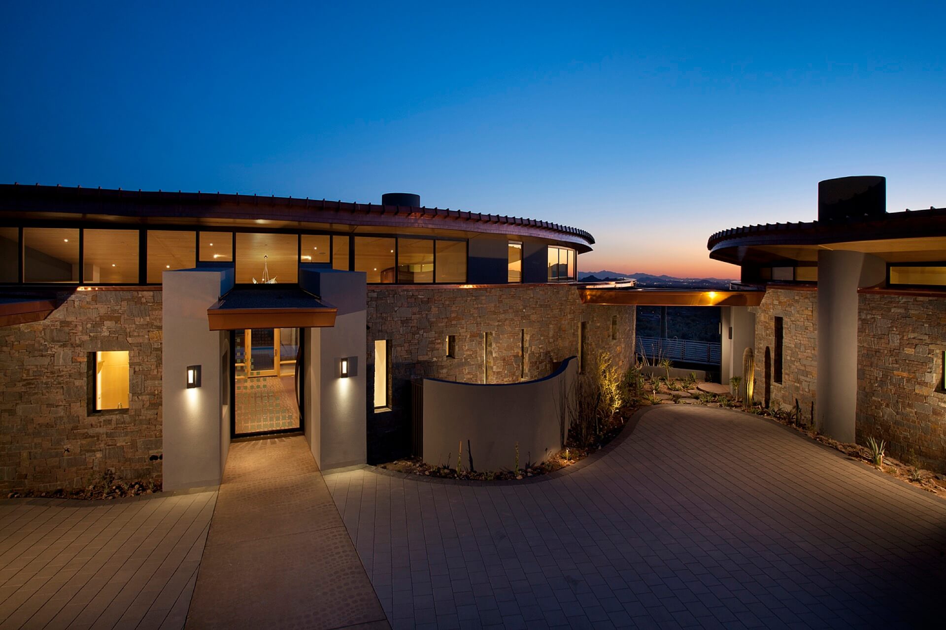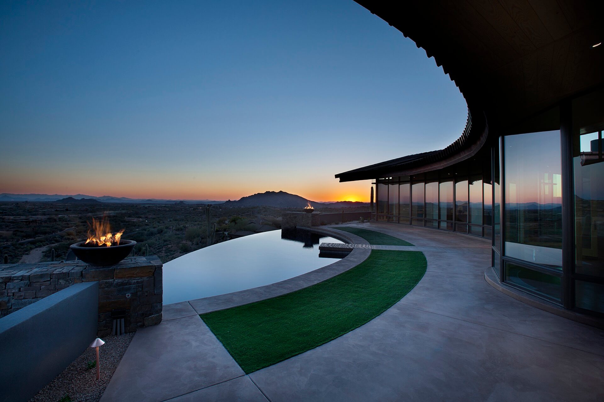 This 5,982 square foot contemporary hillside home in North Scottsdale pays homage to Frank Lloyd Wright’s hemicycle of intersecting arcs and circles. The outward curve of the home focuses on views across the pool out to the Desert Mountain valley below. The roof design is sloped low on the southern exposure protecting the interior from the sun’s harsh rays, sloping up along the north allowing natural light to flood the interiors. It features an infinity pool, a dog run, and a guest home, three bedrooms, and four baths.