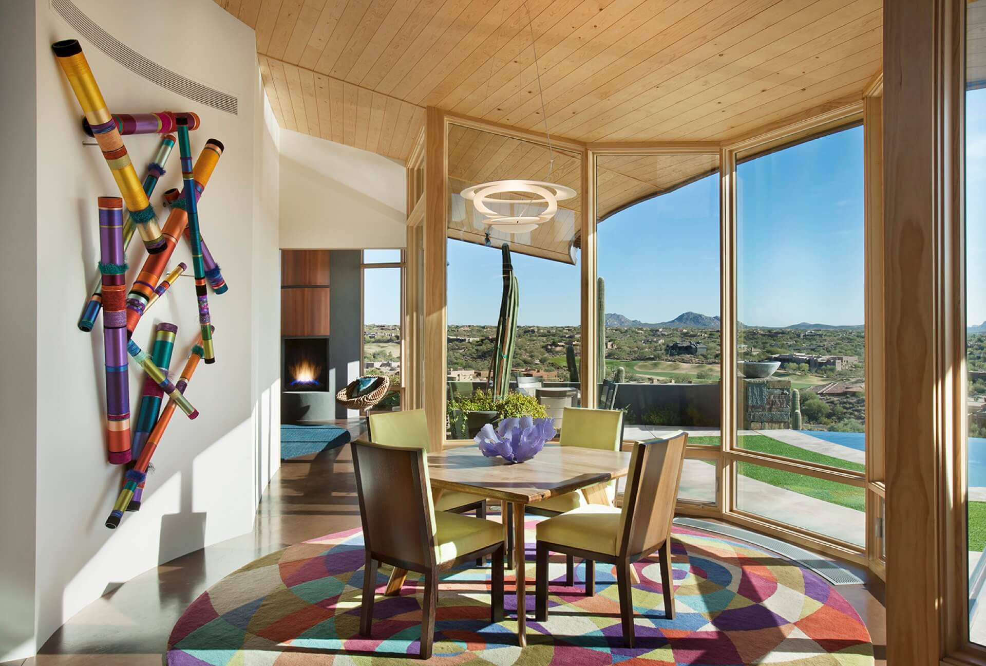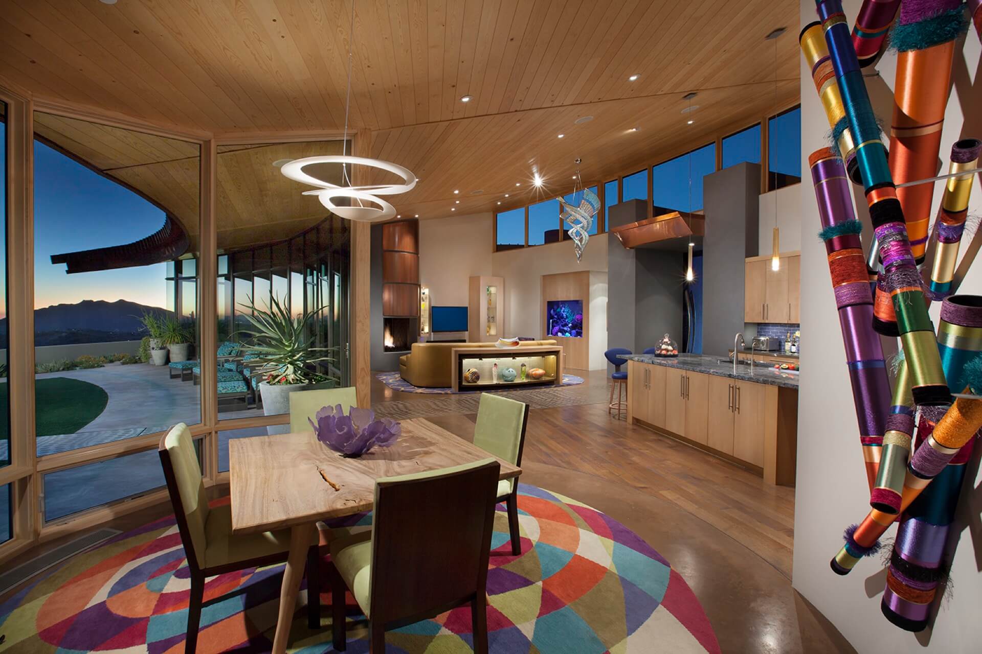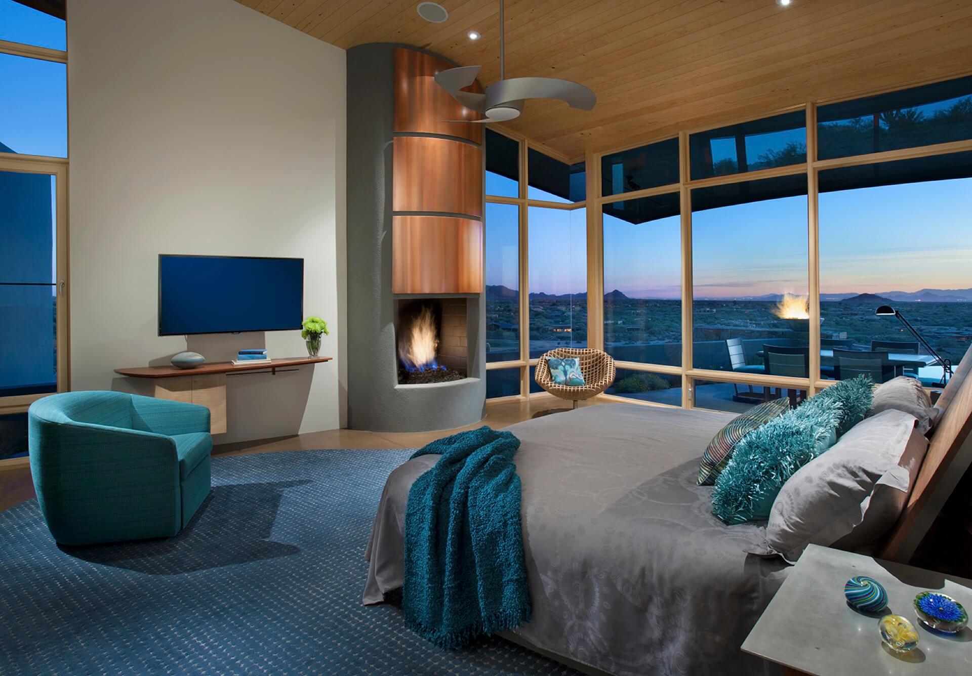 This 5,982 square foot contemporary hillside home in North Scottsdale pays homage to Frank Lloyd Wright’s hemicycle of intersecting arcs and circles. The outward curve of the home focuses on views across the pool out to the Desert Mountain valley below. The roof design is sloped low on the southern exposure protecting the interior from the sun’s harsh rays, sloping up along the north allowing natural light to flood the interiors. It features an infinity pool, a dog run, and a guest home, three bedrooms, and four baths.