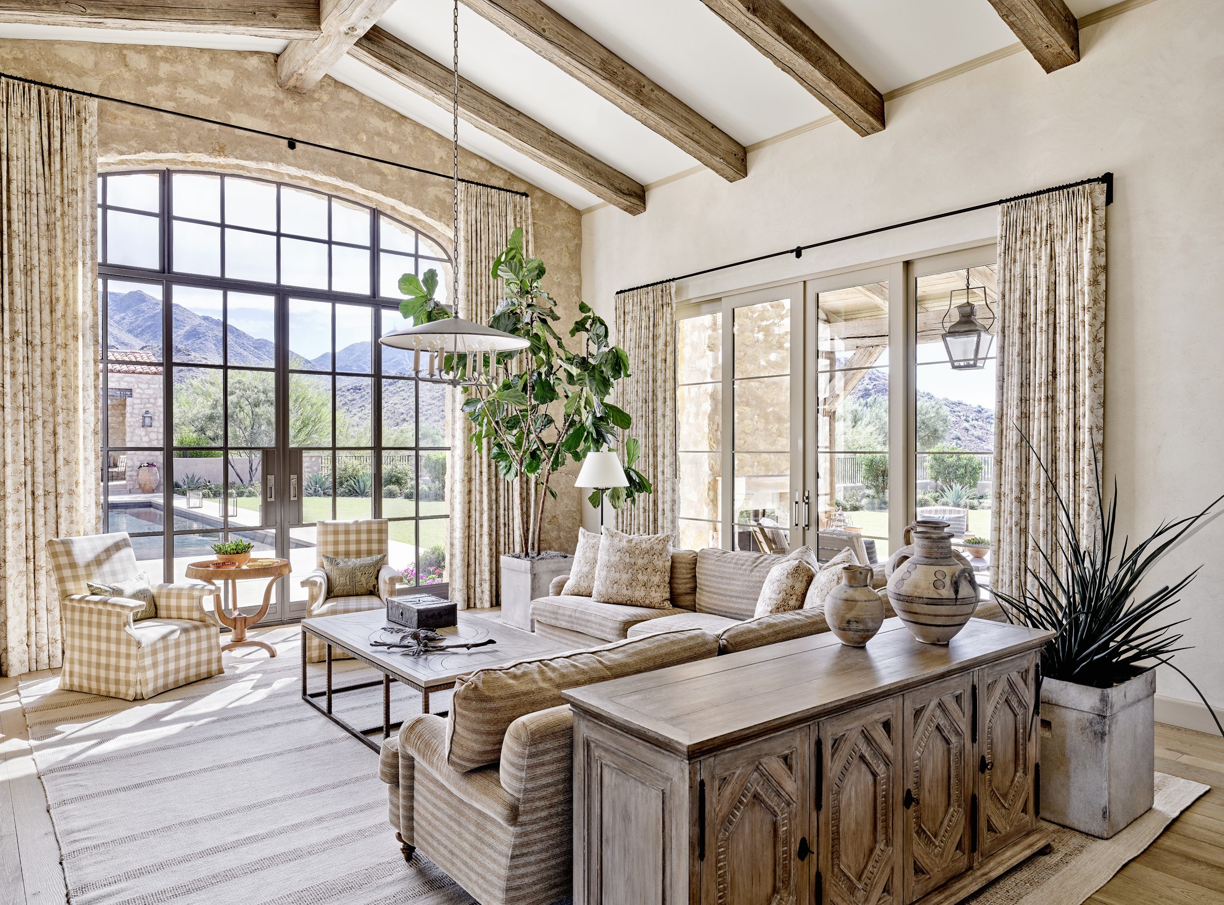 The primary living area is anchored by expansive steel sash windows at either end, reinforcing the home’s axial relationship to the mountains. Overhead, reclaimed wood beams and an antique French fireplace introduce a sense of history and craftsmanship, while carefully curated furnishings and textiles—linen, waxed linen, and other tactile fabrics—add depth without excess.
