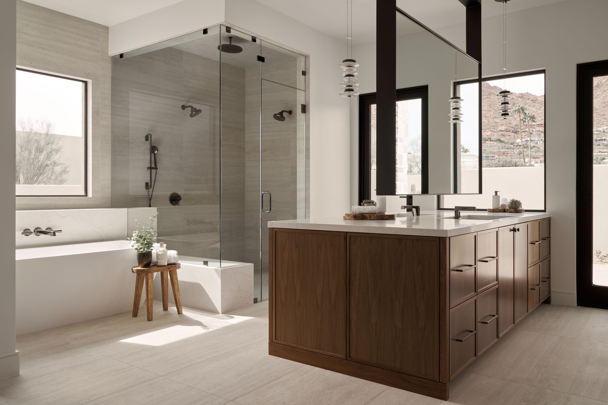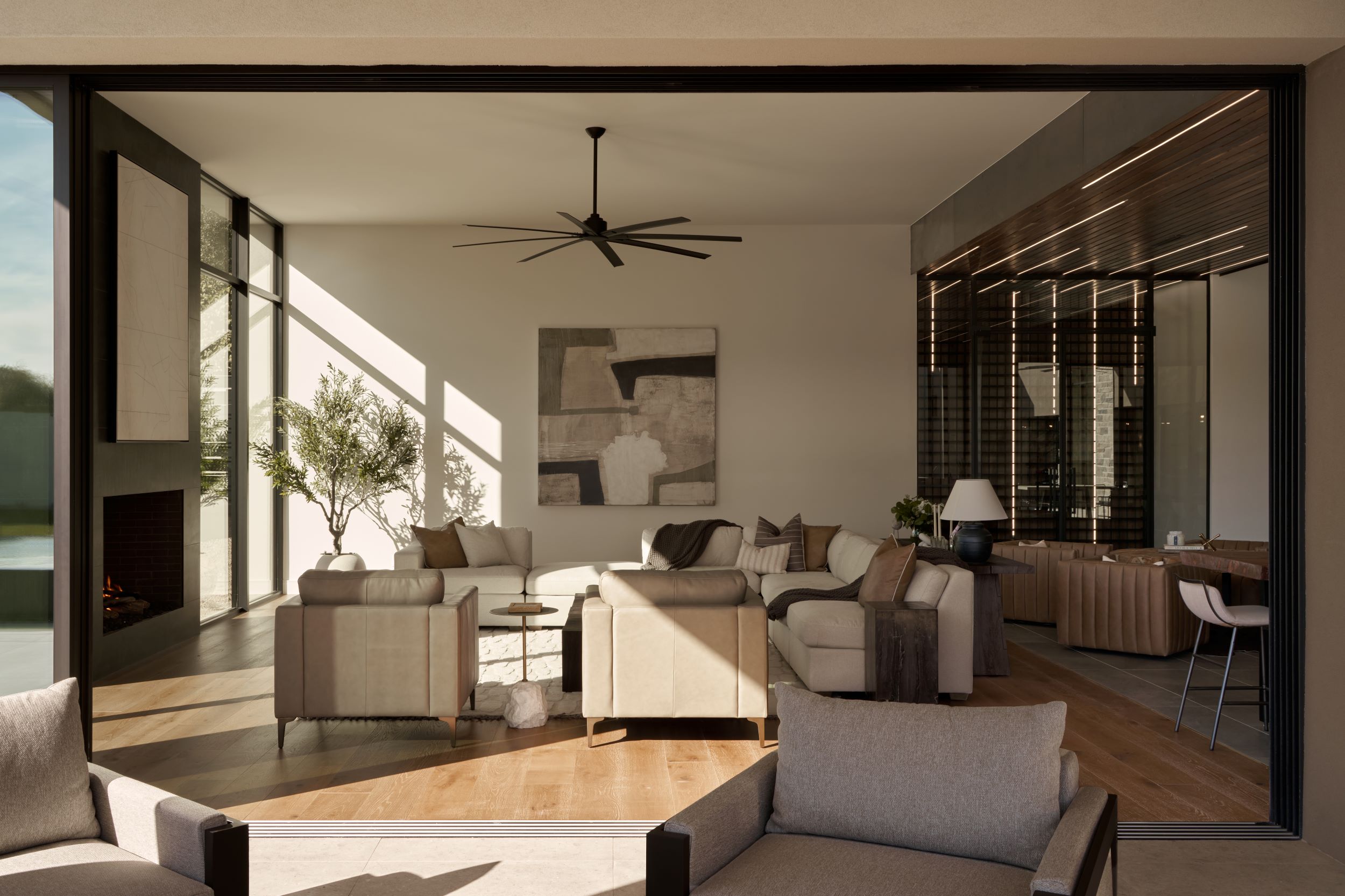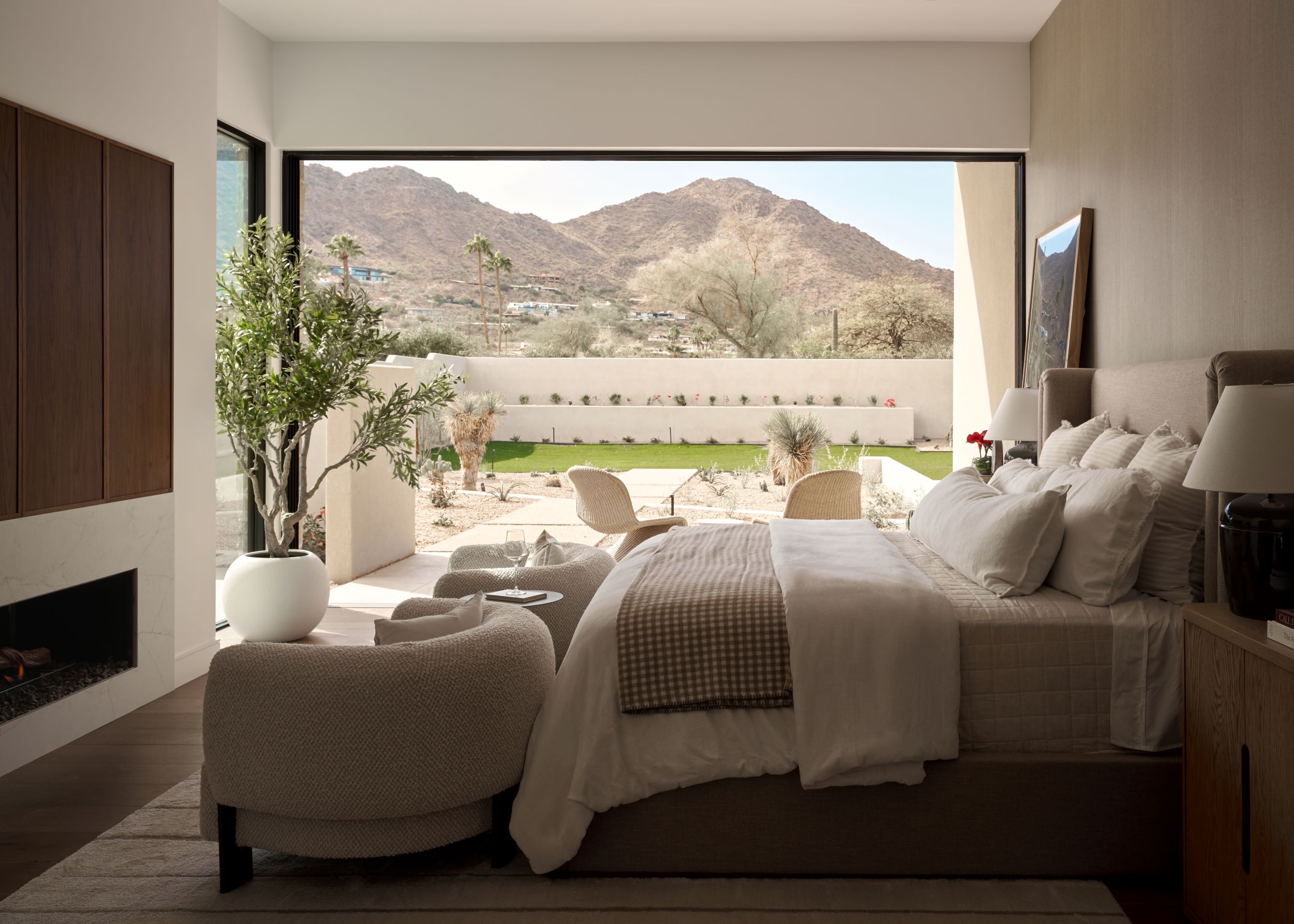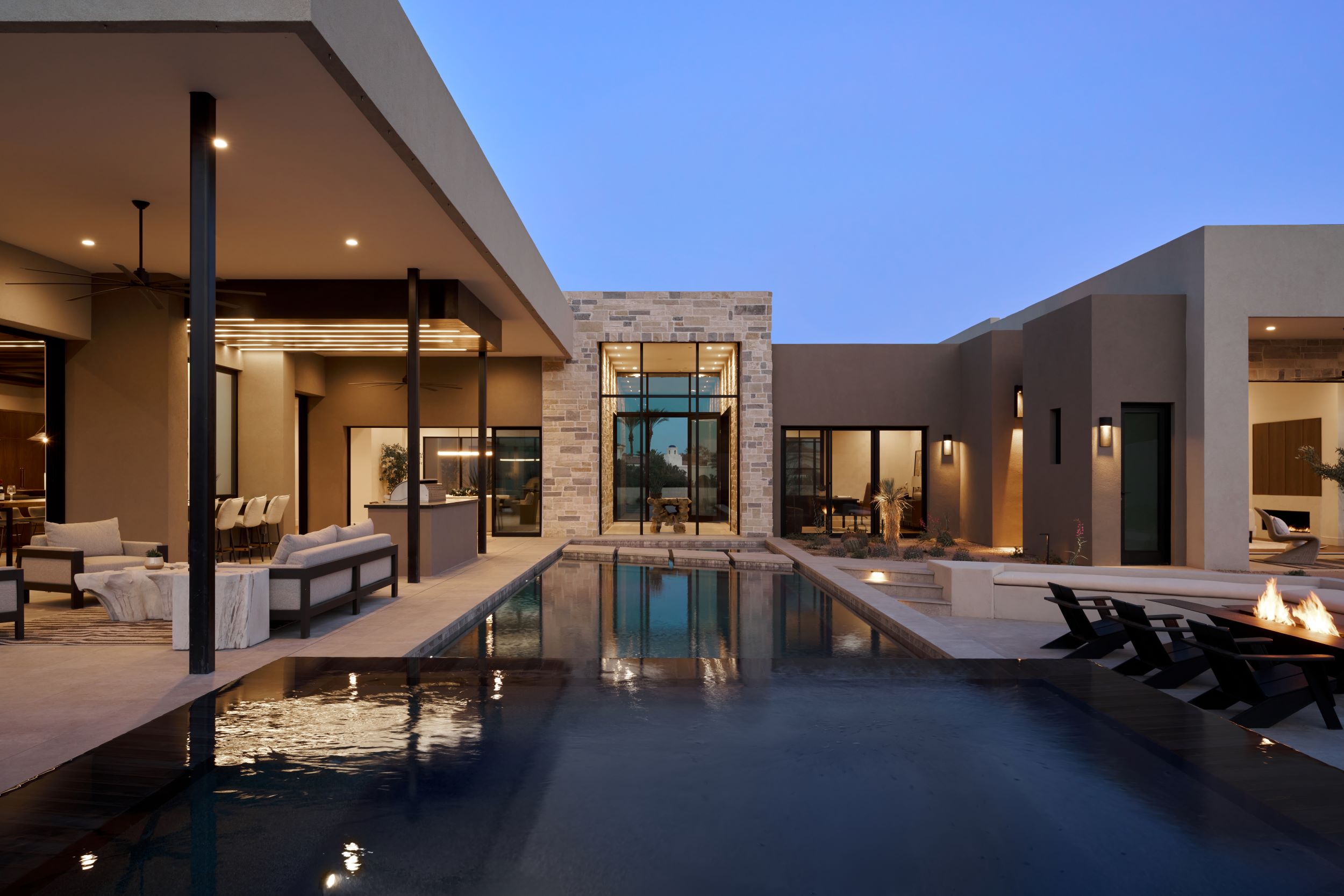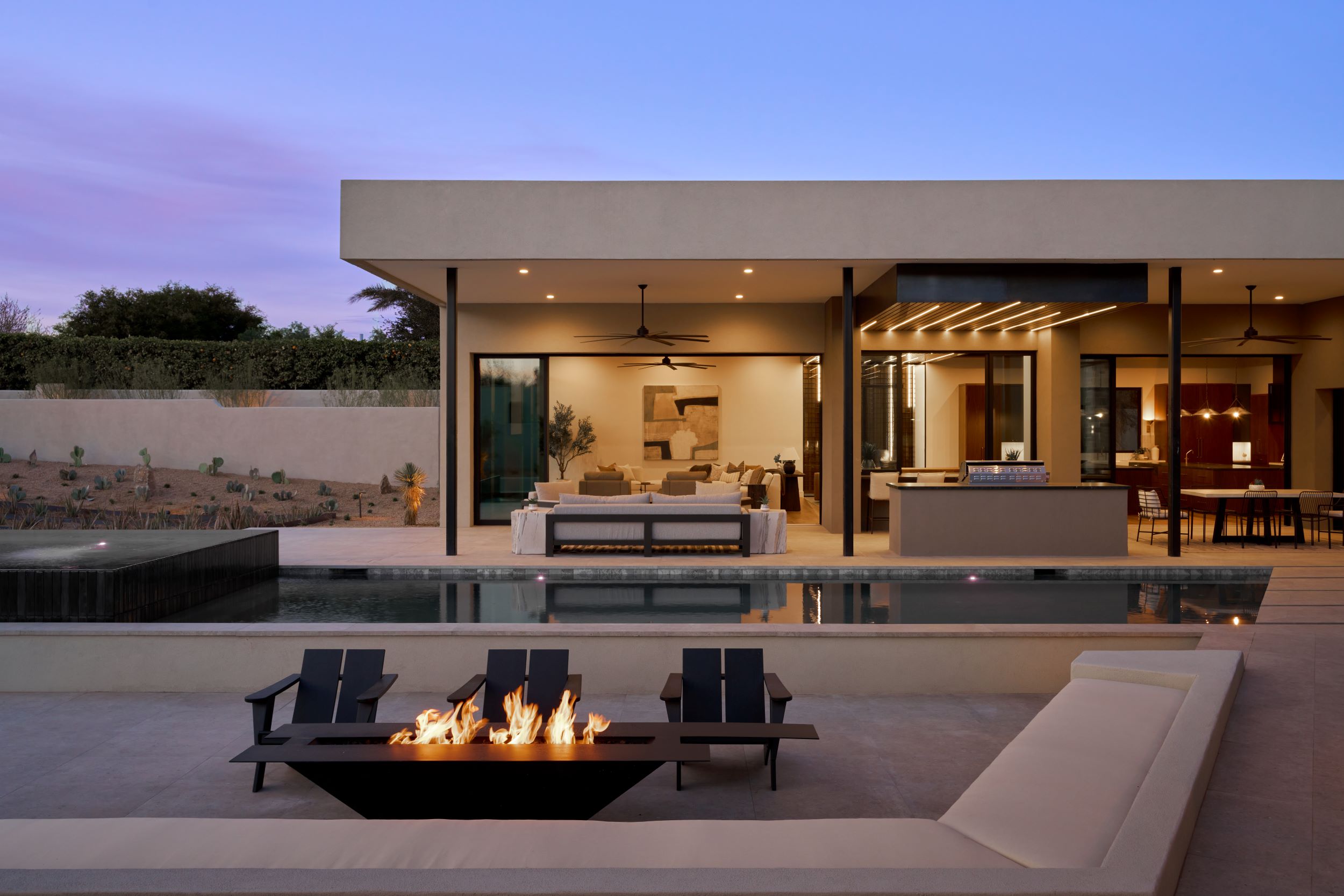 Drawing inspiration from modern desert resorts, PHX designed this home to evoke a sense of resort-style luxury—light, clean, and seamlessly connected to its surroundings. The indoor/outdoor bar, soaring ceilings, and expansive high windows blur the lines between inside and out, creating a tranquil, airy retreat. The Great Room and Kitchen fully open to the patio and pool, where desert landscaping enhances the serene ambiance.