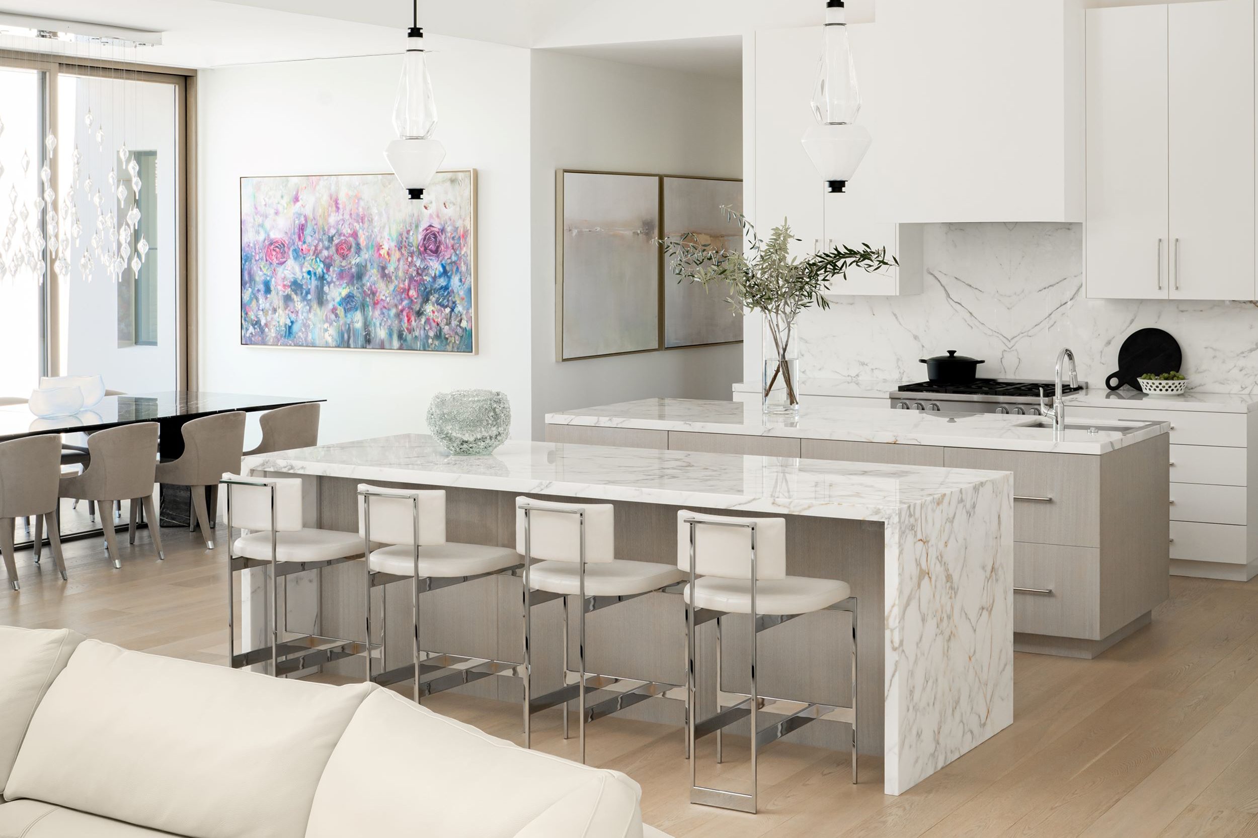 Additionally, the “Arizona modern” architecture is designed to provide a sense of privacy and intimacy despite the expansive surroundings. The home features a series of deep, flat roof planes and overhangs that seem to float over the landscape. The recesses create shadows and protect the floor-to-ceiling glass walls from excessive exposure. Plus, the team didn’t carry the patio walls down to the ground so the natural wash could flow under the building.