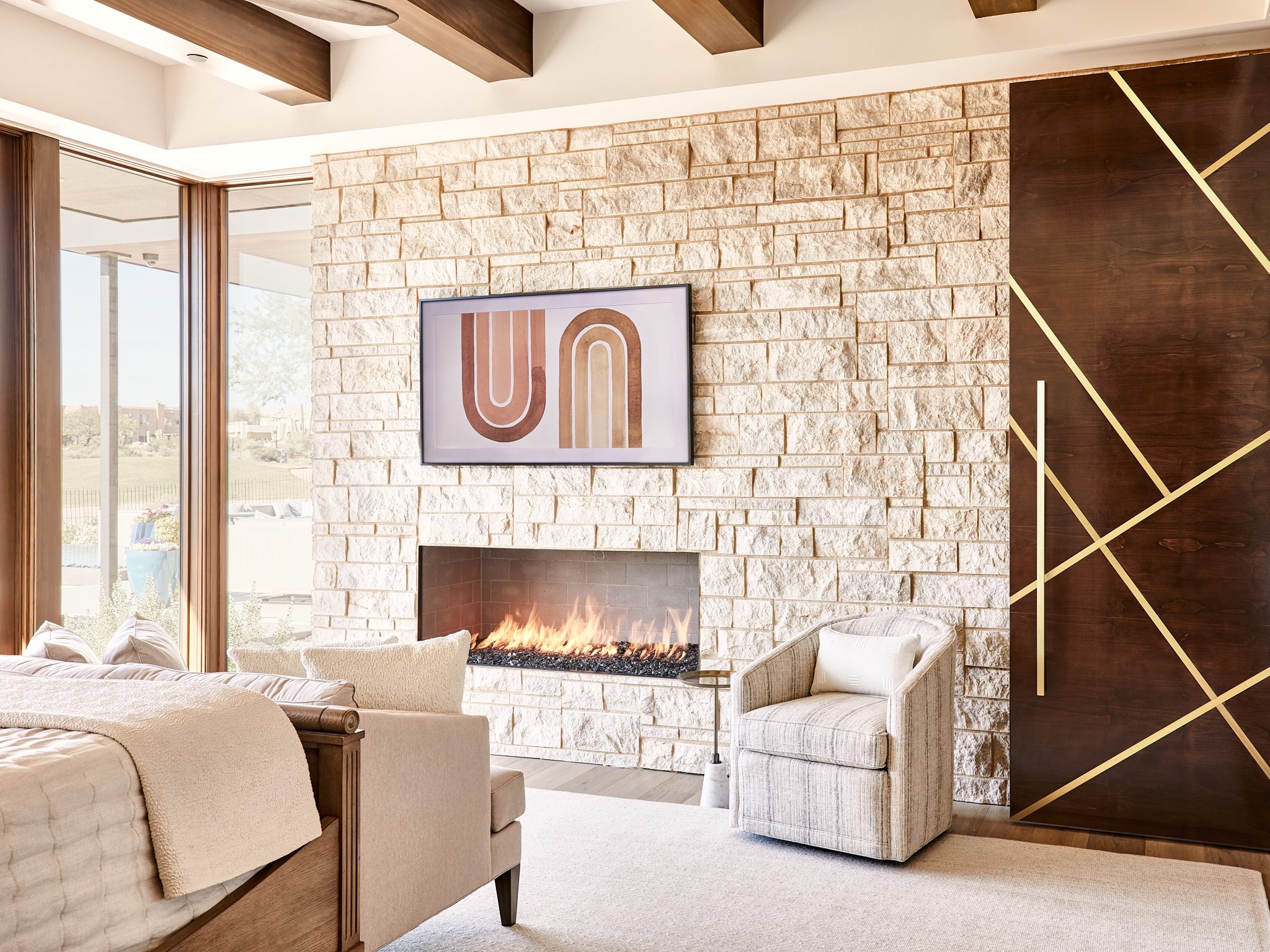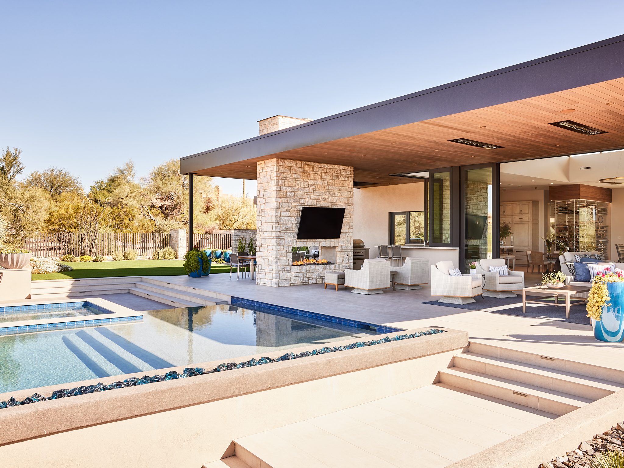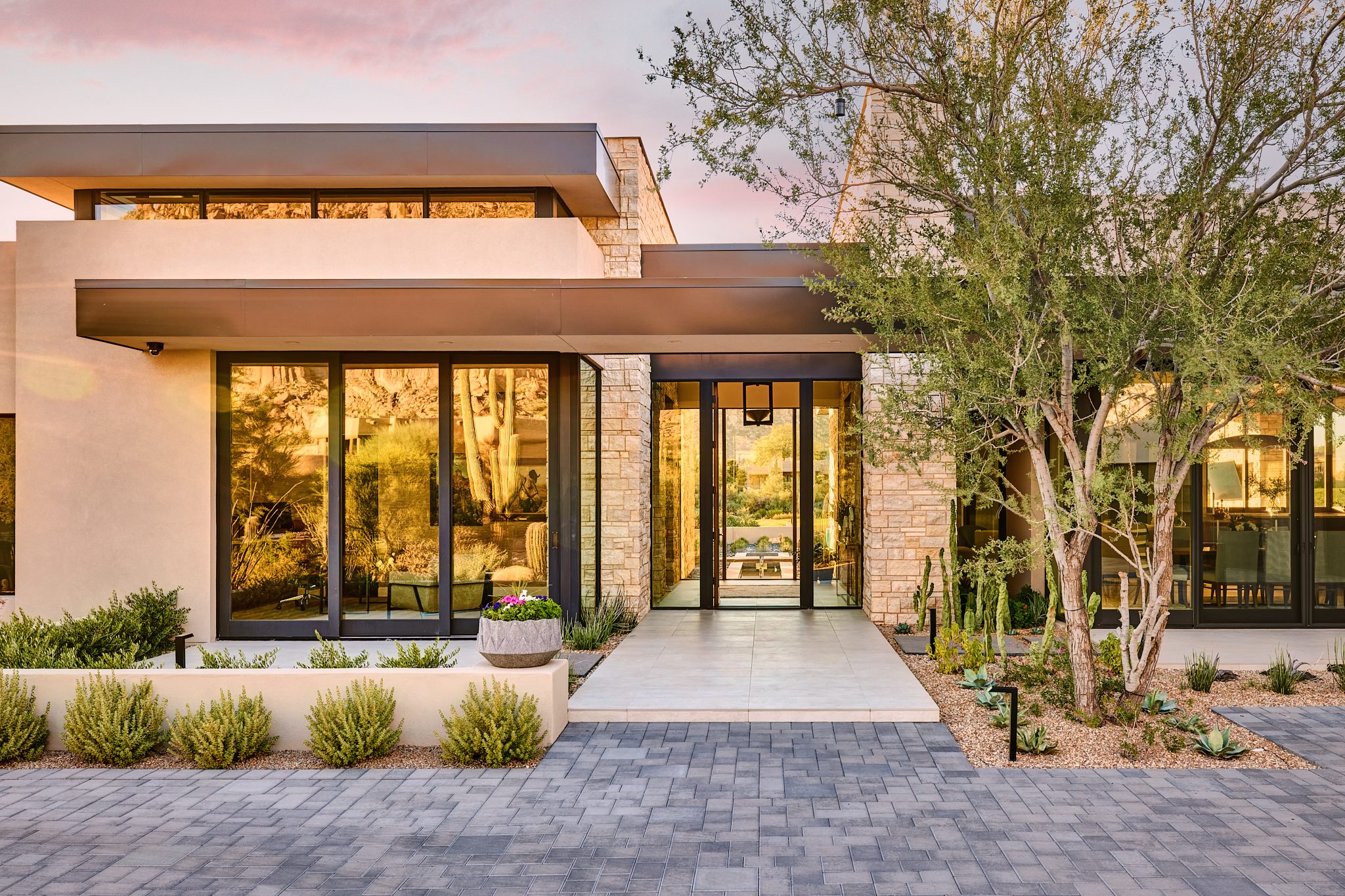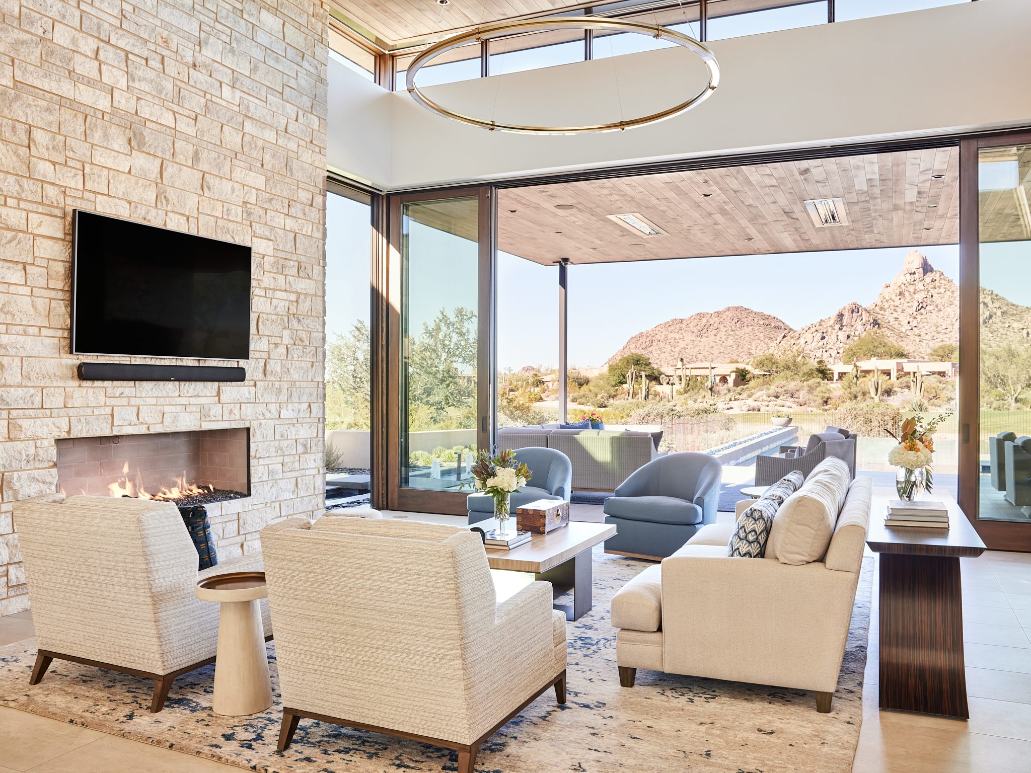 A vision in the desert. This Contemporary North Scottsdale residence was designed with the client in mind. The main goal was to capture the views of Pinnacle Peak from any angle. The client desired an open-plan living space that is connected to the outside. The great room concept was an integral part of the floor plan and overall design with the architectural stone-clad walls linking and bringing the outside to the inside and vice versa. From the moment you walk up to the front door, you are greeted with a visual link to the outside living space and patios beyond. The foyer acts as a ‘bridge’ to separate the main house from the owner’s suite. The great room with its corner glazing and inside-outside bar creates a visually striking space that blurs the boundaries between indoor and outdoor living. The overall design aesthetic is one of beauty with clean lines and a simple palate of materials that compliments the desert setting.
