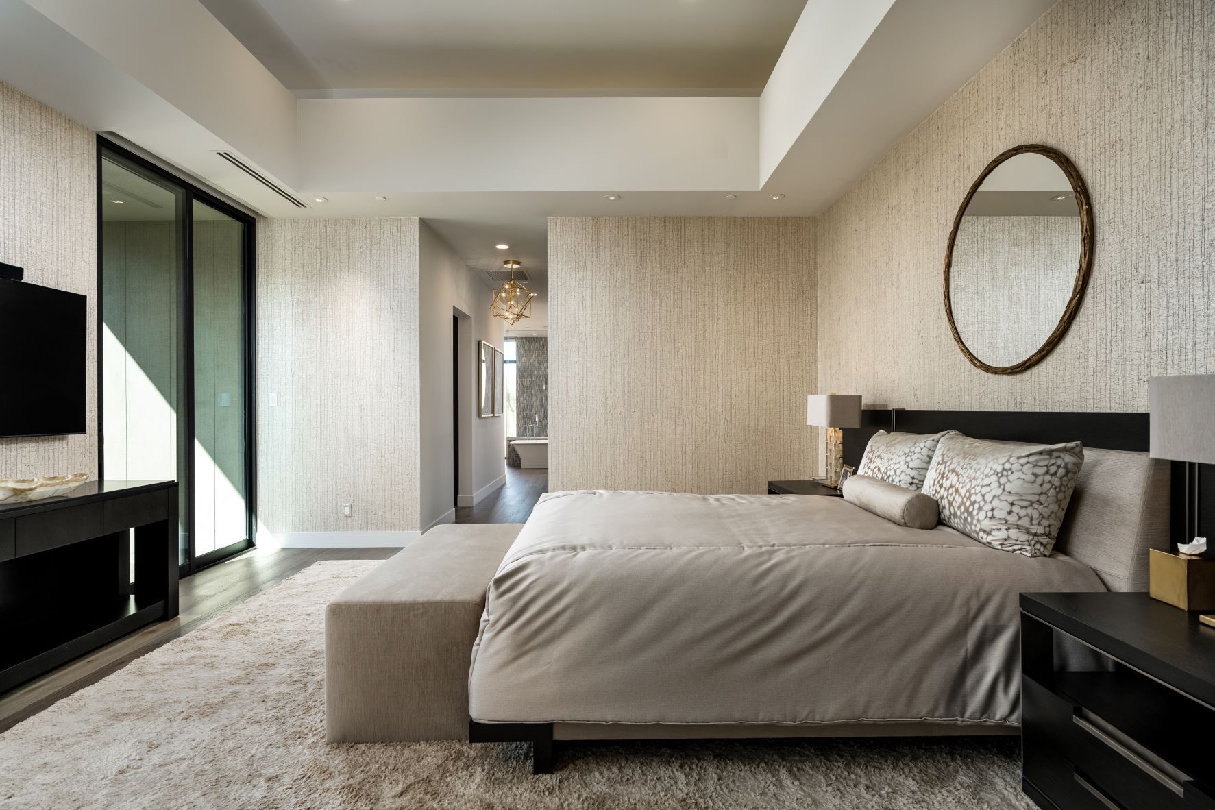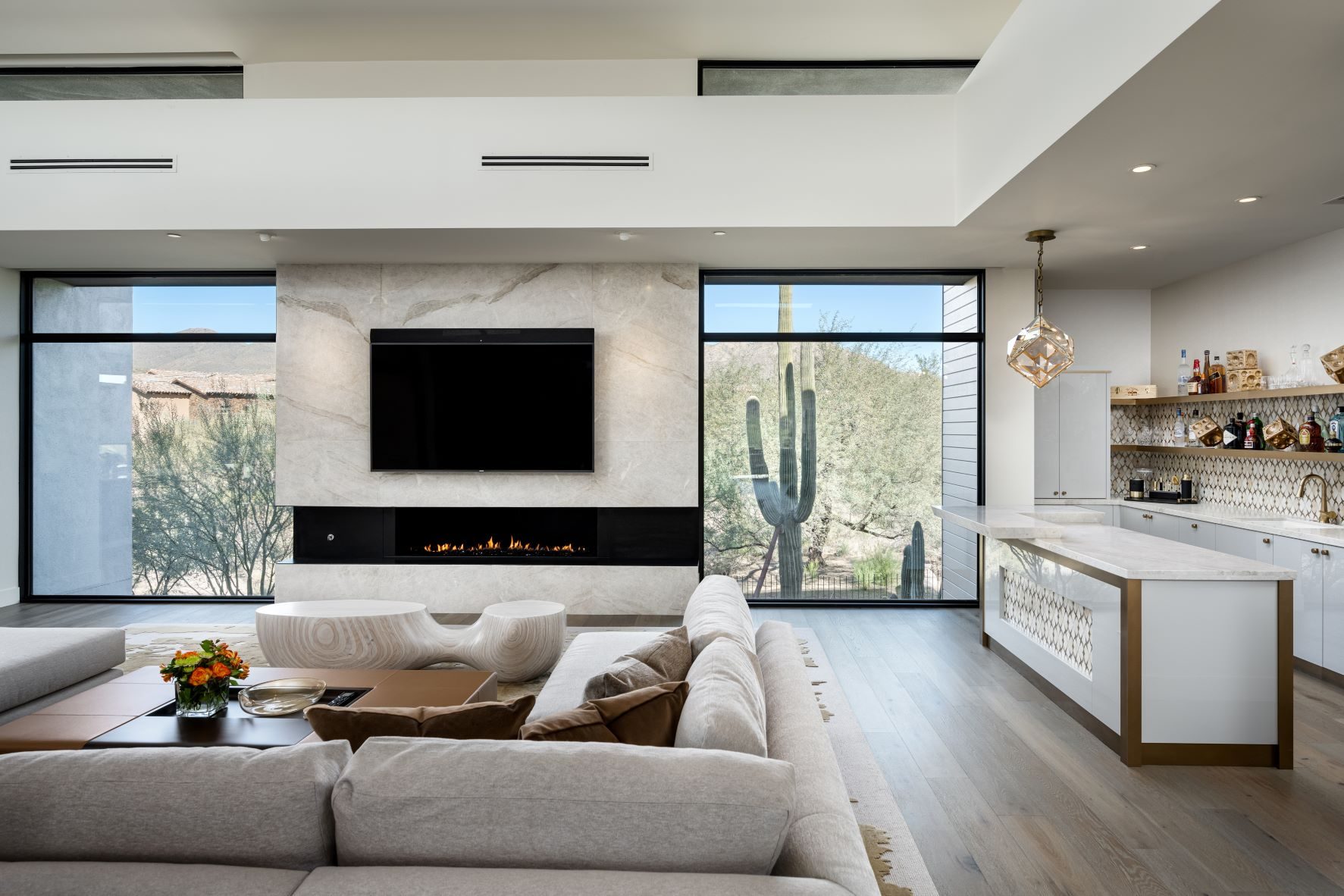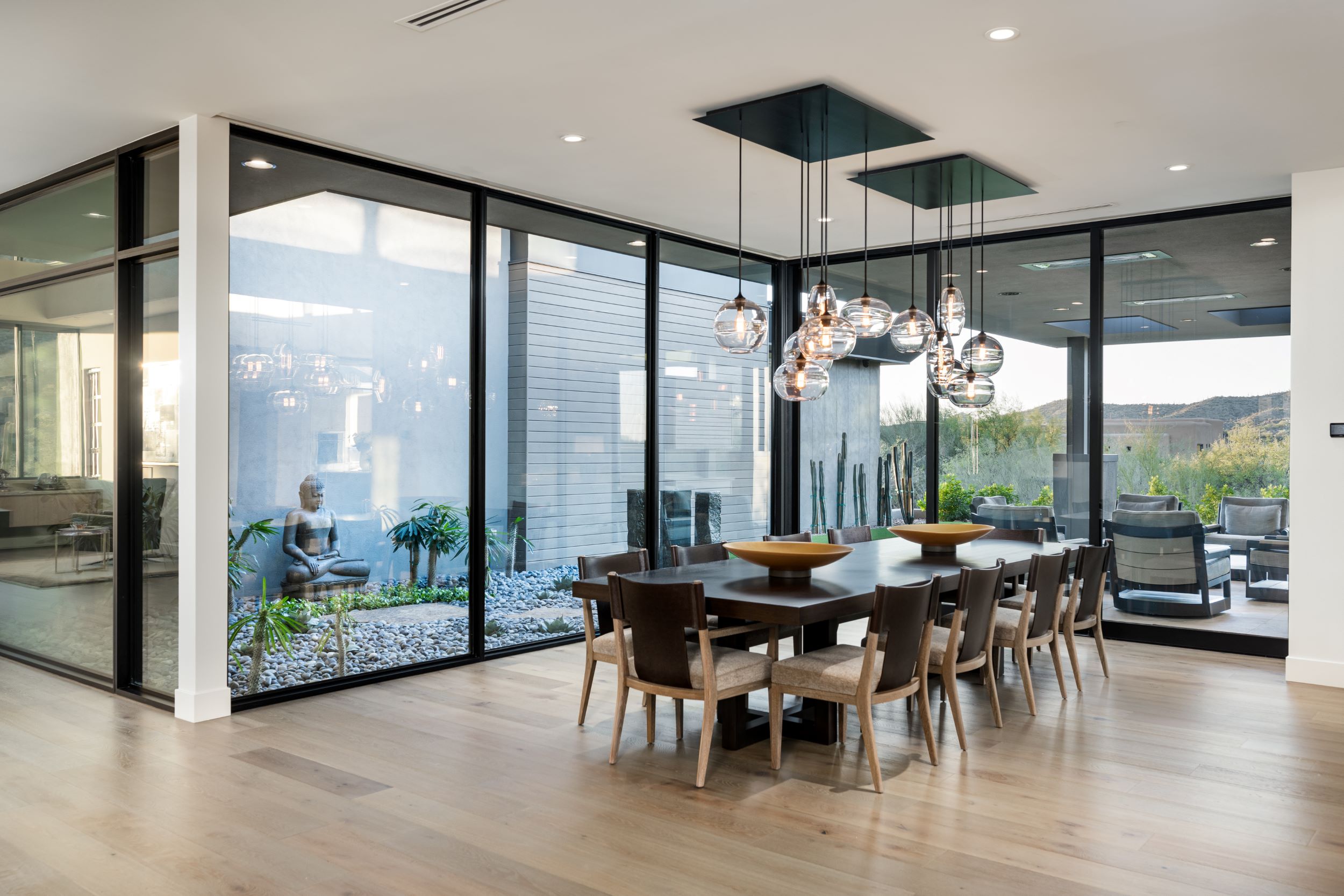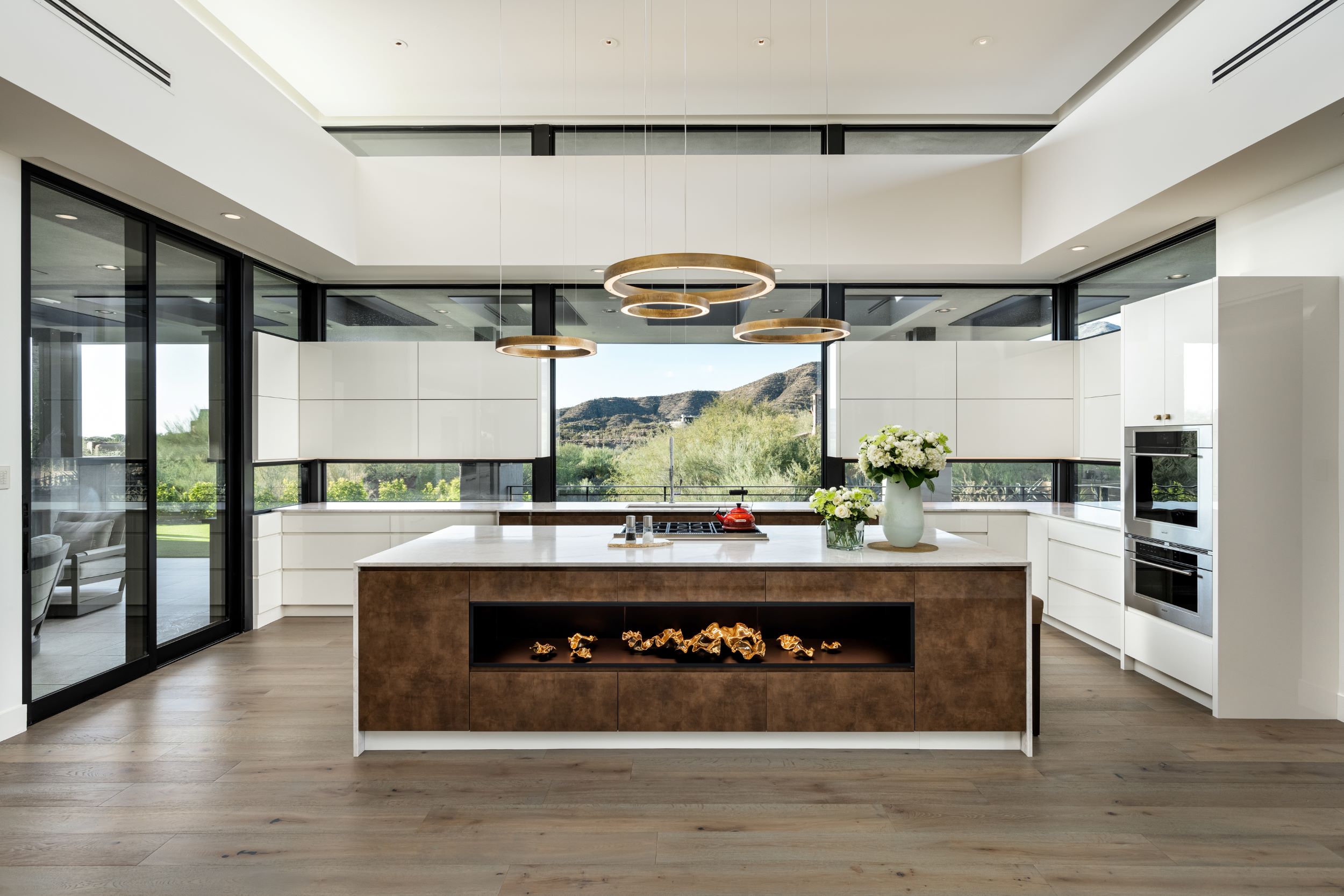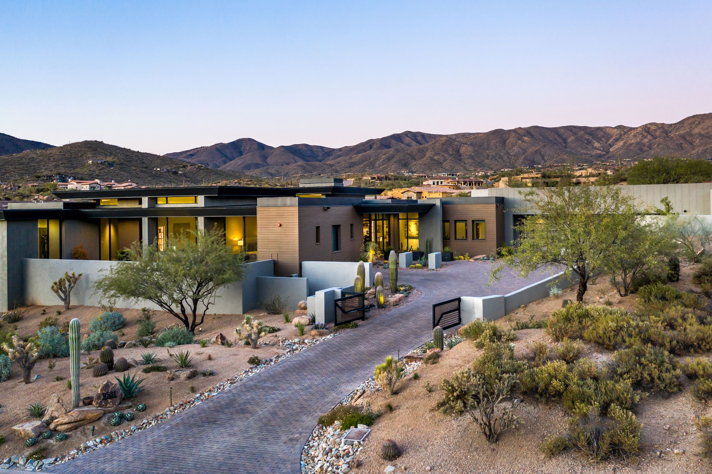 This incredible contemporary residence in Desert Mountain totals 5,690 livable square feet. The home includes 3 bed/ 3.5 bath, as well as a 3 car garage, guest casita, Zen garden, and a study. The sharp lines and color palette of white, silver, and gold create an elegant yet modern aesthetic. In addition, the exterior design was influenced by the surrounding mountains and desert landscape.