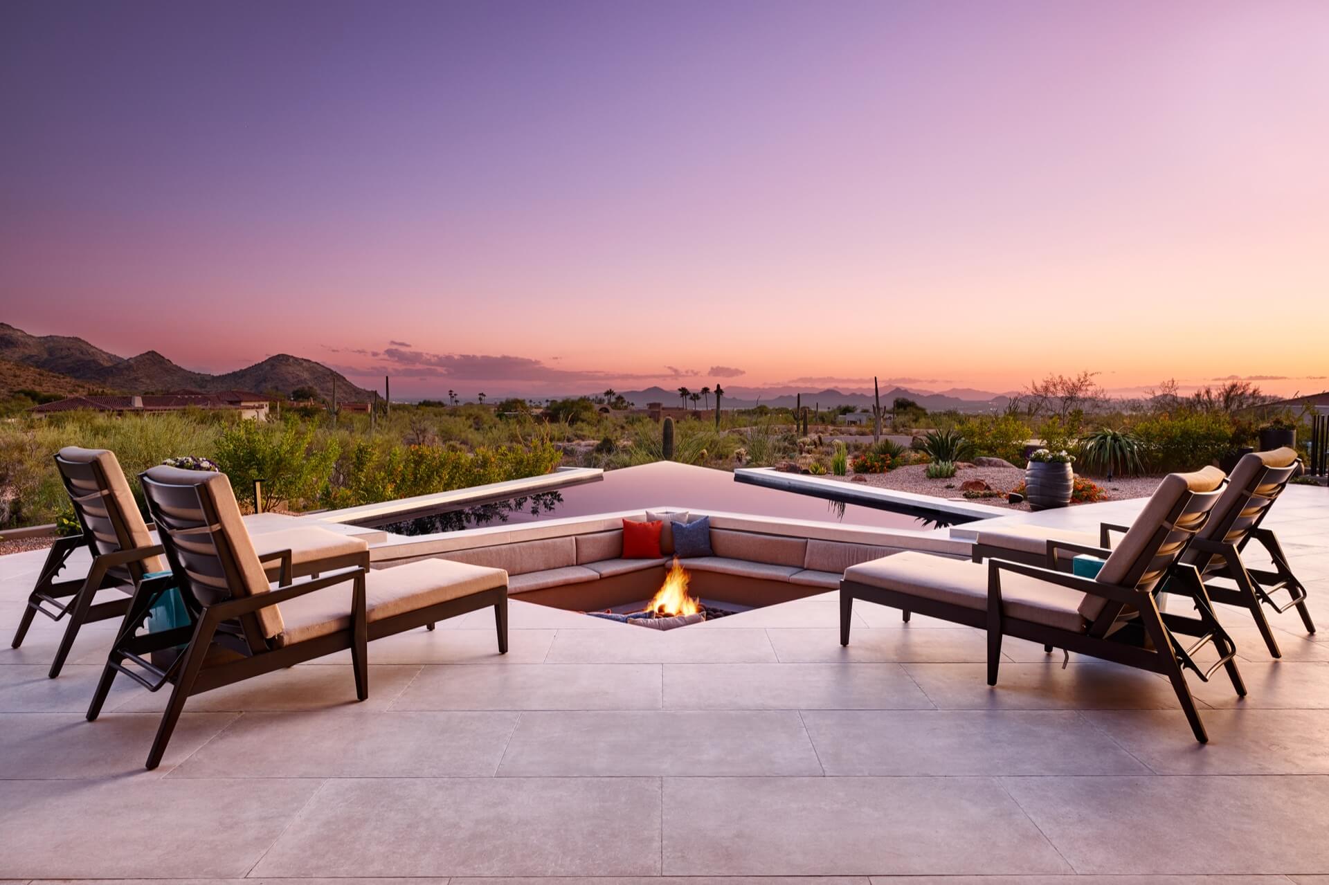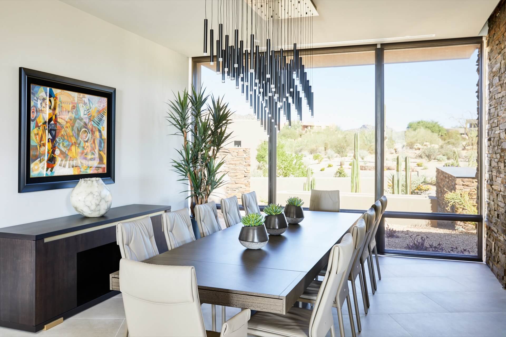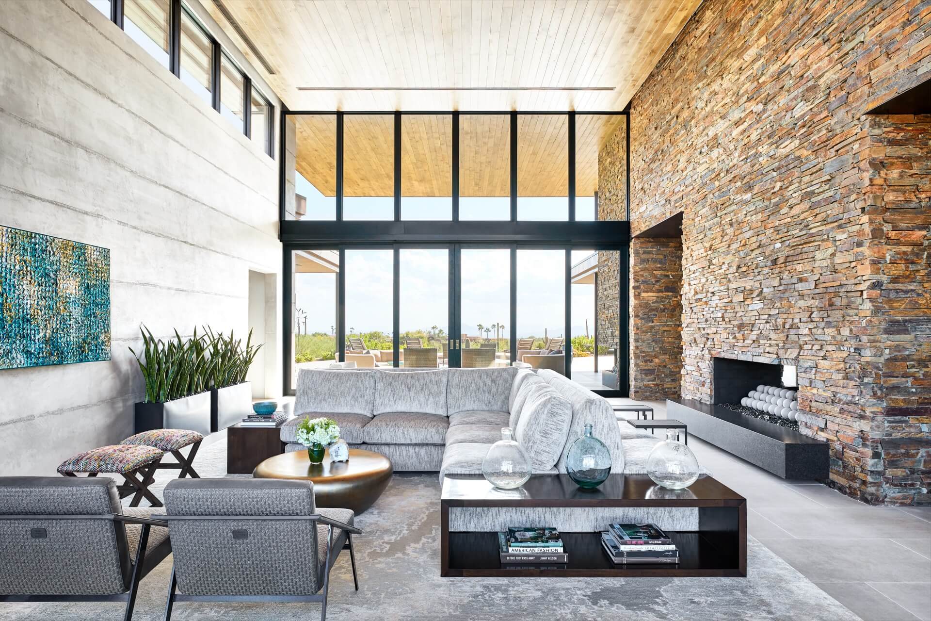 Located in North Scottsdale, this contemporary home totals over 7,400 sq. ft. PHX designed the home for a couple that was looking to make new memories in a new custom-built home. When the homeowners were looking to build, they had their sights set on a home that embodies the desert landscape they learned to love. Enamored by the Frank Lloyd Wright style of Architecture, they knew Erik and PHX were the perfect fit for their dream home. Two of our favorite features are the wooden accent wall that is backlit, which adds to the modern yet inviting atmosphere, as well as the sprawling views that you experience both inside and outside the home. Built for entertaining, the main great room features a captivating stone fireplace and floor-to-ceiling windows.