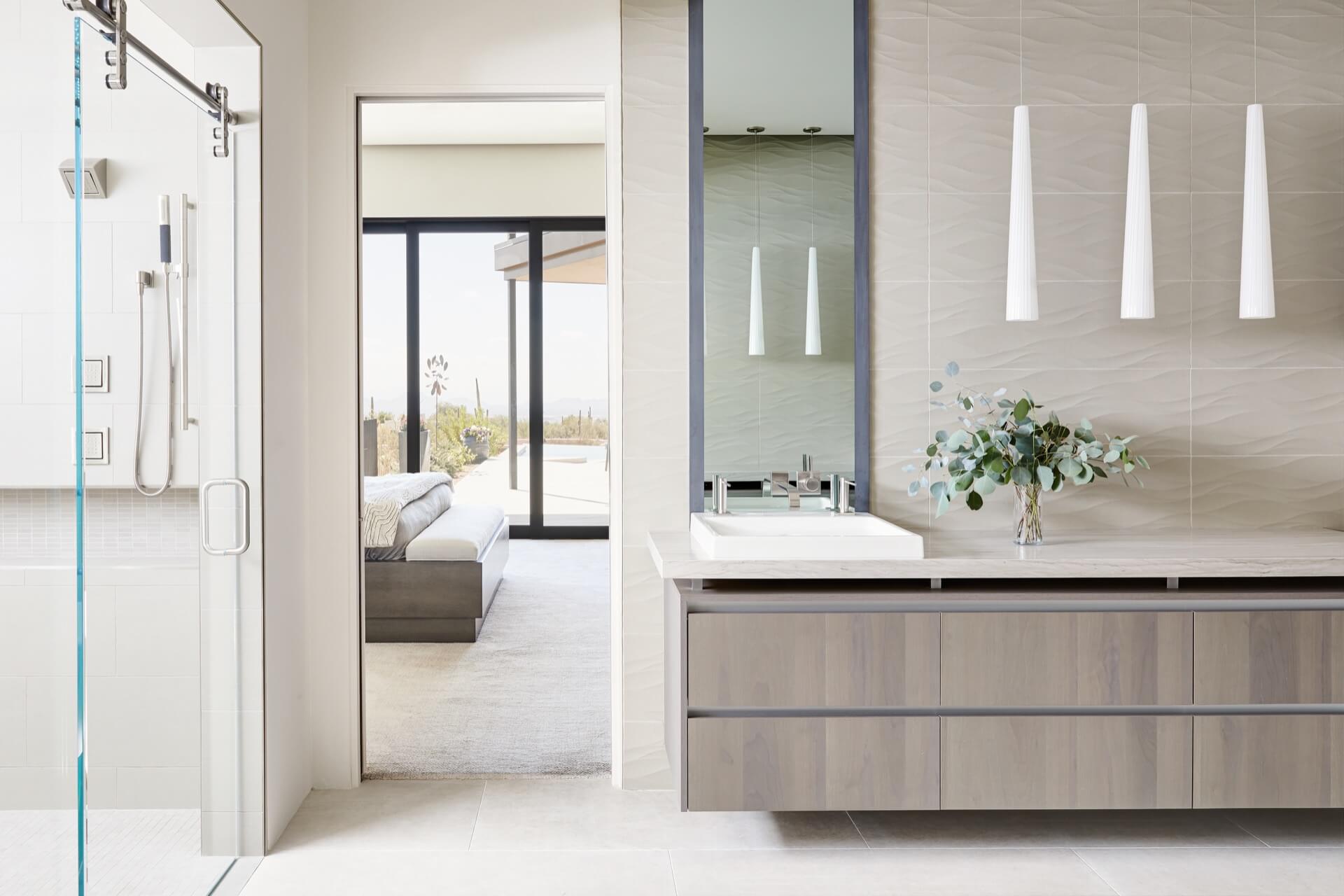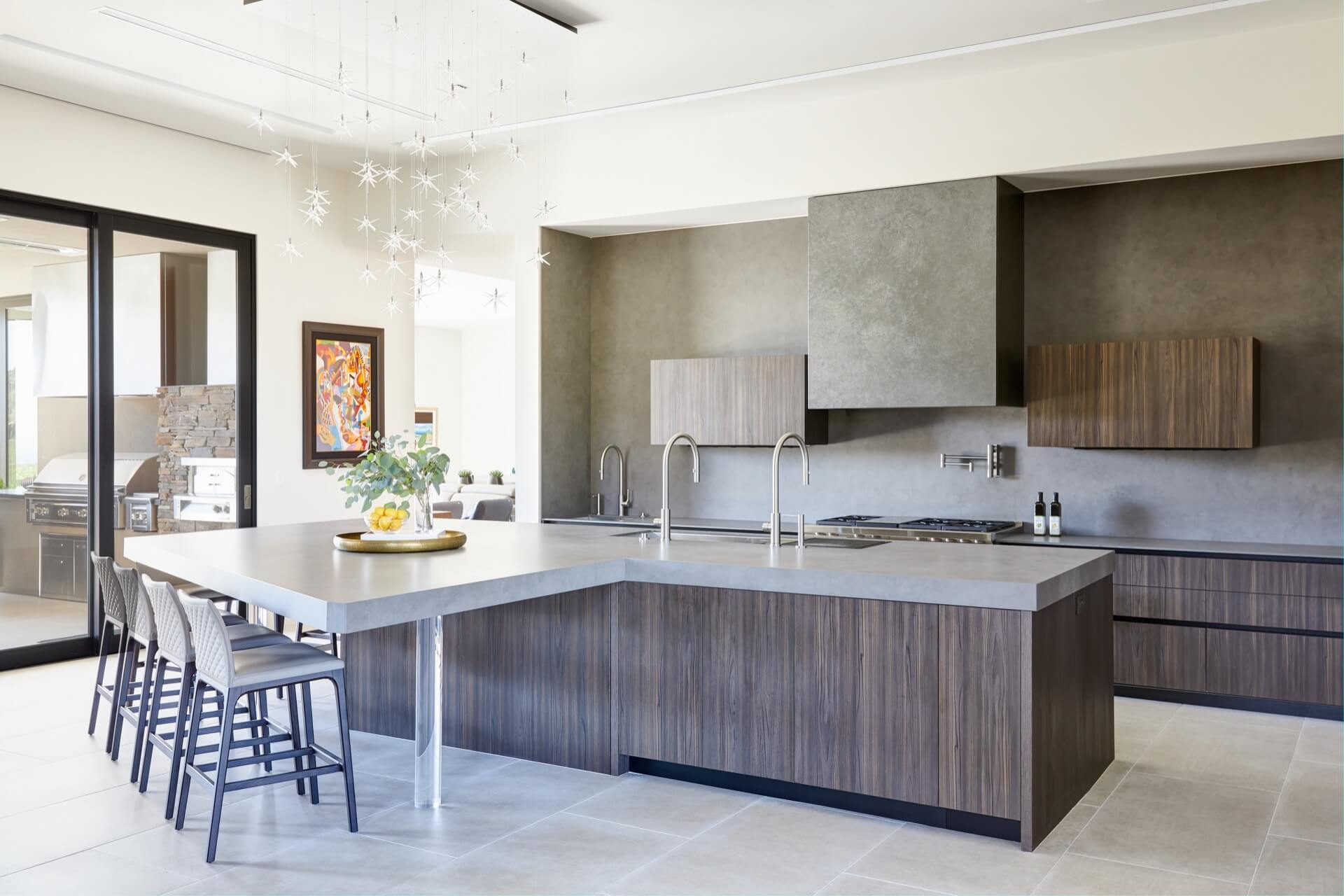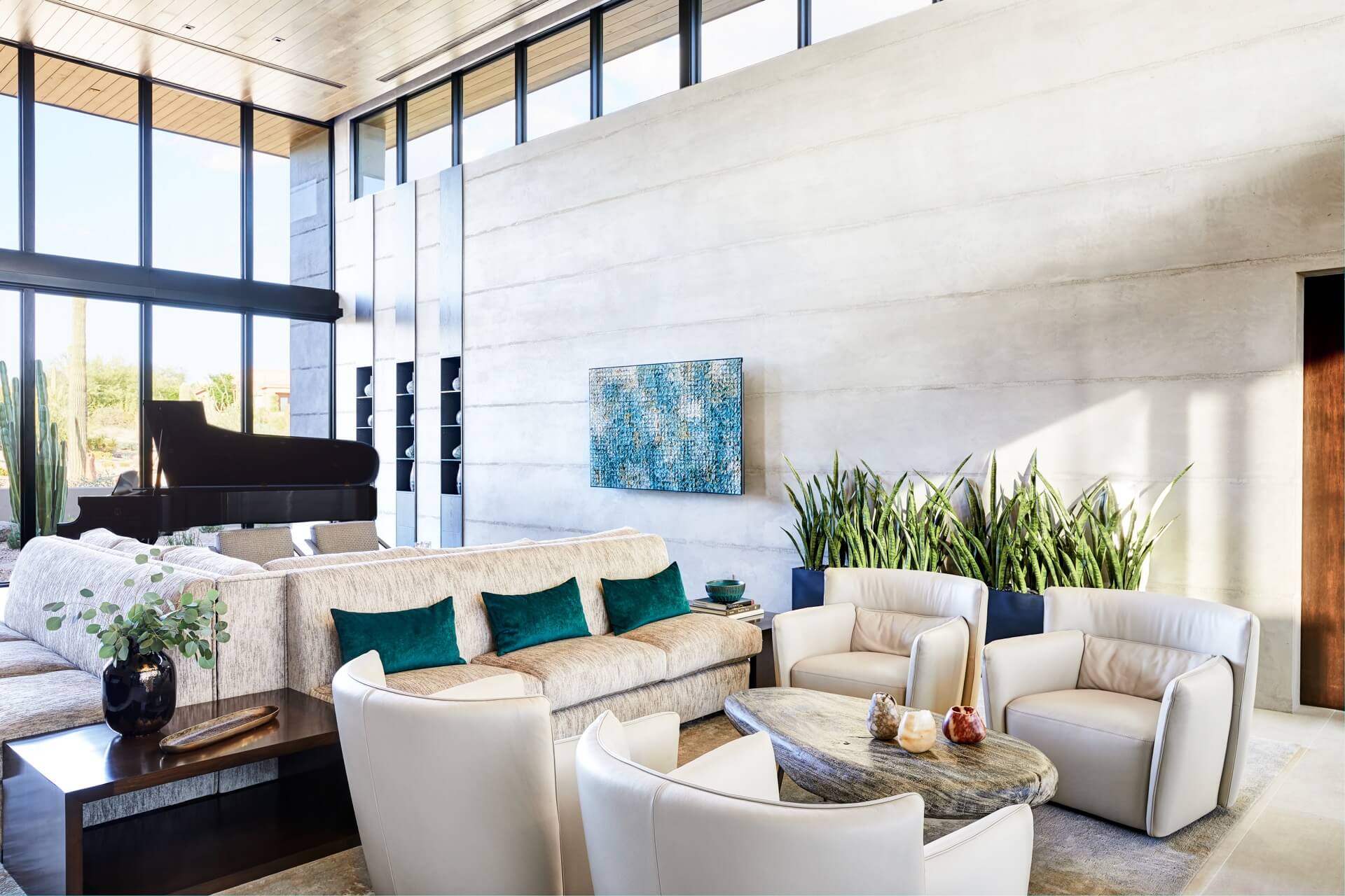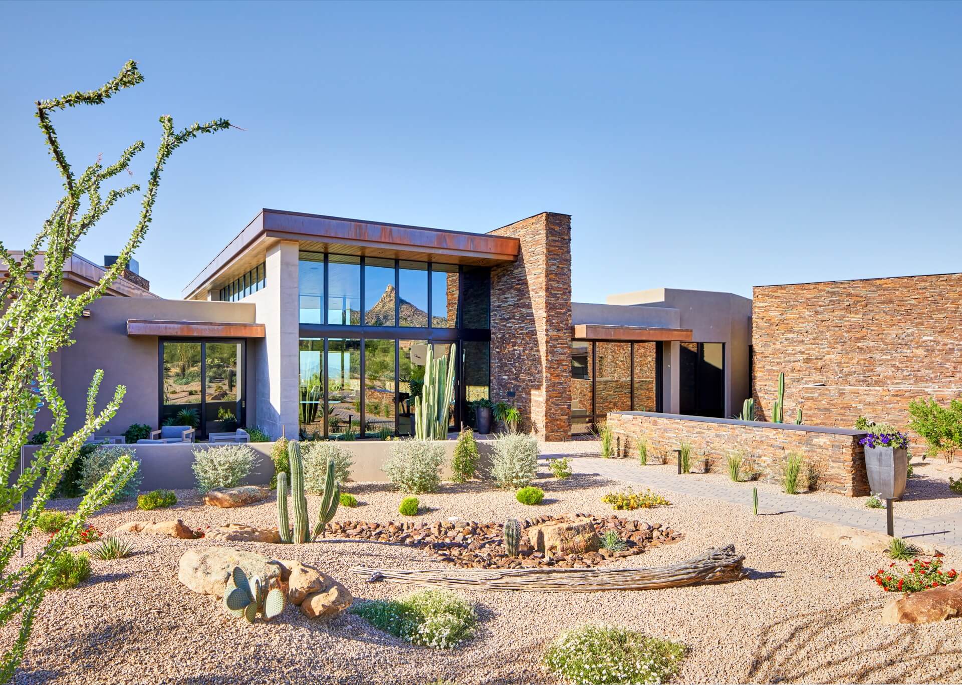 Located in North Scottsdale, this contemporary home totals over 7,400 sq. ft. PHX designed the home for a couple that was looking to make new memories in a new custom-built home. When the homeowners were looking to build, they had their sights set on a home that embodies the desert landscape they learned to love. Enamored by the Frank Lloyd Wright style of Architecture, they knew Erik and PHX were the perfect fit for their dream home. Two of our favorite features are the wooden accent wall that is backlit, which adds to the modern yet inviting atmosphere, as well as the sprawling views that you experience both inside and outside the home. Built for entertaining, the main great room features a captivating stone fireplace and floor-to-ceiling windows.